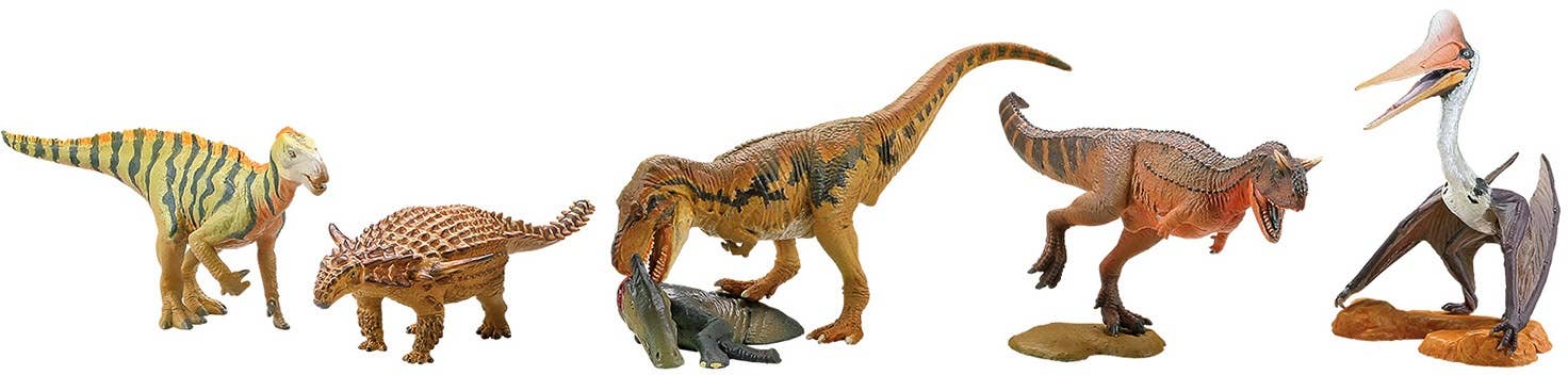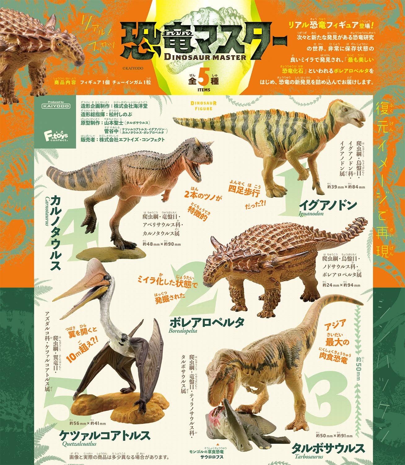 This newest set of realistic dinosaur figures from F-Toys features five completely new molds! More discoveries are being made by dinosaur researchers all the time, and some of the most recent are in this set, including Borealopelta, an astonishingly well-preserved fossil excavated in 2011. Other favorites include Tarbosaurus, Asia's largest carnivorous dinosaur, and the immense flying reptile Quetzalcoatlus. Each figure includes a piece of gum, too. There are five different figures, and you'll get two of each in the box. Order yours now!