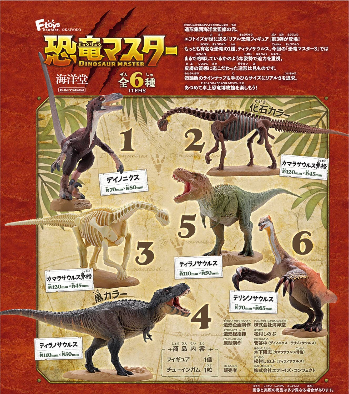 F-Toys brings us their third lineup of highly realistic dinosaur figures! In this collection, the emphasis is on power, with roaring postures and lifelike poses! The texture of each dinosaur's skin is carefully modeled for a heightened sense of realism. There are six figures to trade and collect, and you'll get one of each; each figure comes with a piece of gum, too. Order yours today and enjoy a dinosaur museum on your own desktop!
