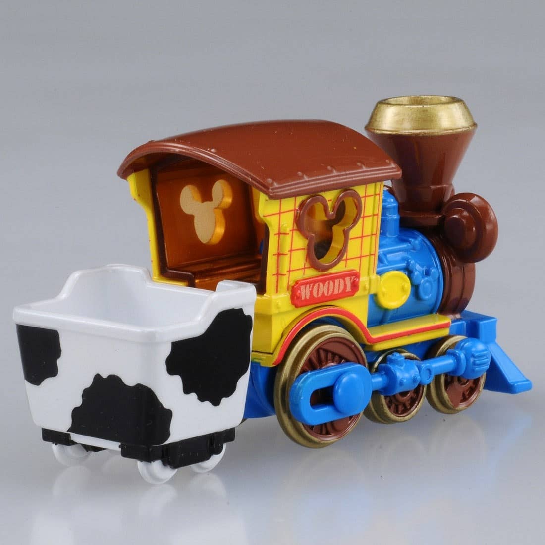 This Disney Motors collectible car is made to resemble Woody from the "Toy Story" franchise! It's shaped like an old locomotive engine and painted blue, brown, and yellow, and pulls a cow-themed wheeled cart behind it.