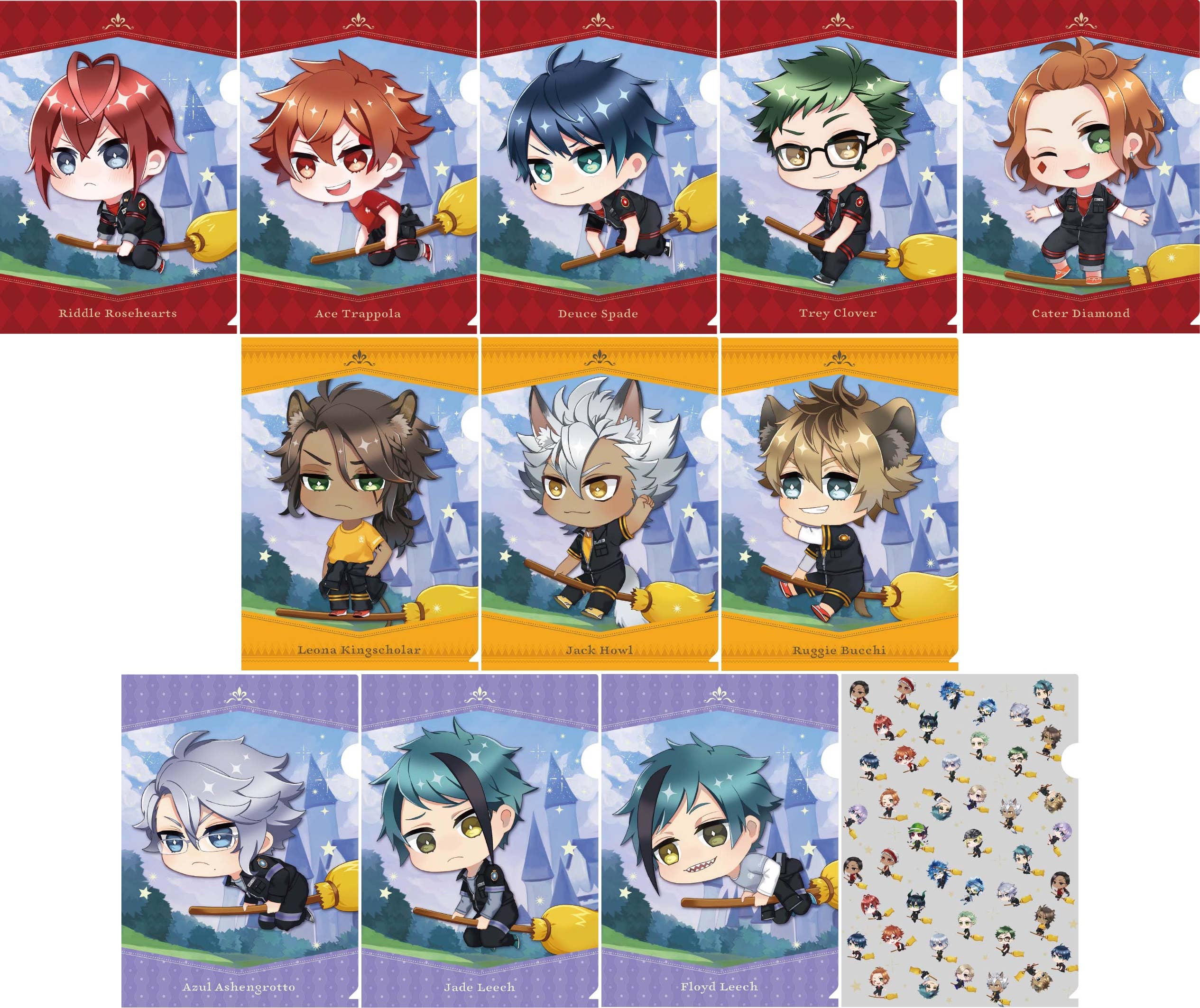 Chibi versions of the gorgeous guys from Disney's "Twisted-Wonderland" take to the skies on broomsticks on these clear files! Similar to flexible plastic file folders, they're just what you need to help organize papers, tickets, and other flat items; this assortment consists of the residents of the Heartslabyul, Savanaclaw and Octavinelle dormitories, as well as a pattern combining them into an all-over pattern. There are 12 different designs available, randomly packed in boxes of 12 -- place your order now!