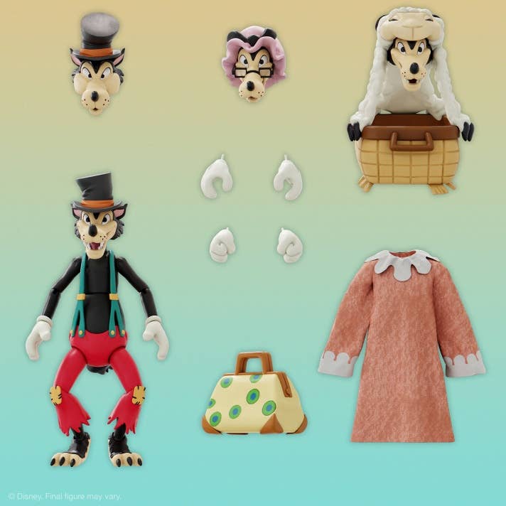 The Big Bad Wolf, as seen in Disney's classic 1934 Silly Symphony "The Big Bad Wolf," gets a fantastic new action figure form Super 7! (He also appeared in 1933's "The Three Little Pigs.") This figure is fully articulated so he can get into all sorts of villainous poses; he comes with four interchangeable heads, including one to disguise himself as Little Red Riding Hood's grandmother, and another to disguise him as a sheep! A nightgown is included to complete his Grandma disguise, and he also has a bag. Order this classic character for your own collection today!
