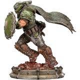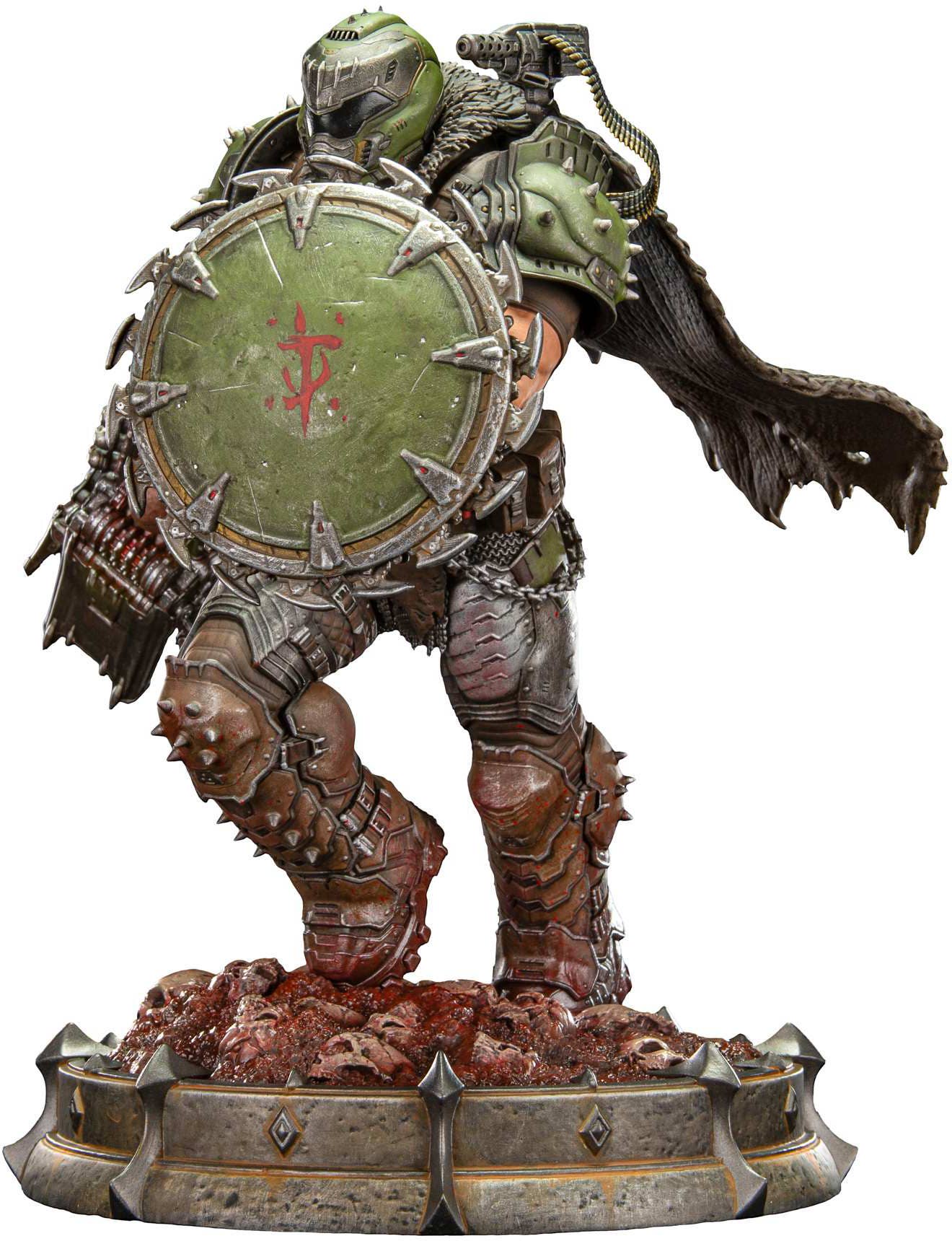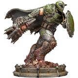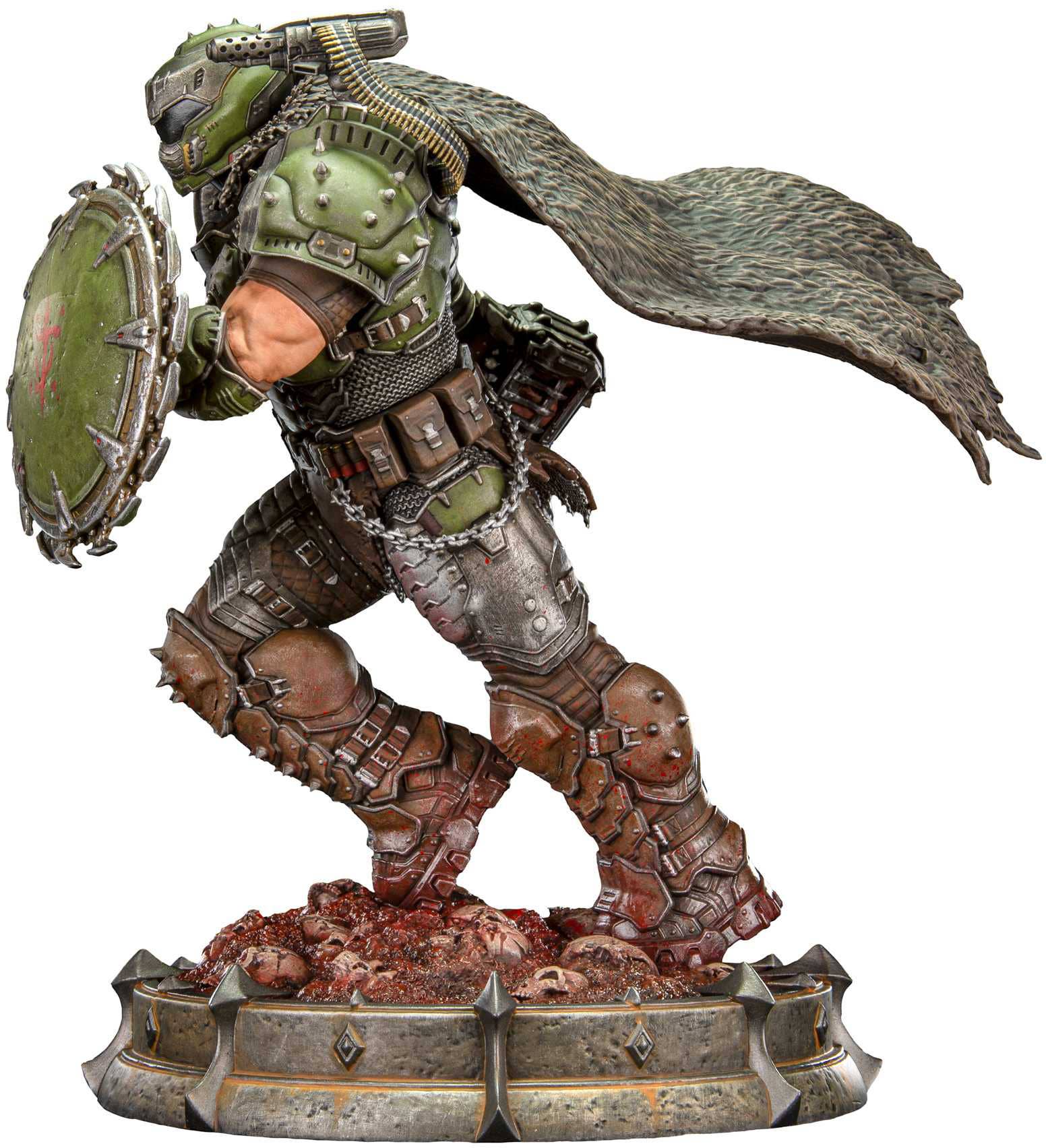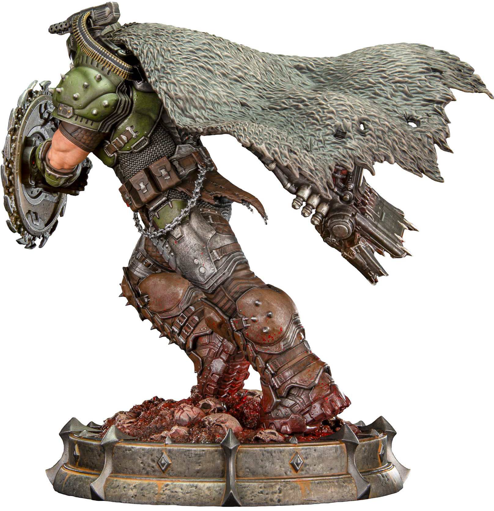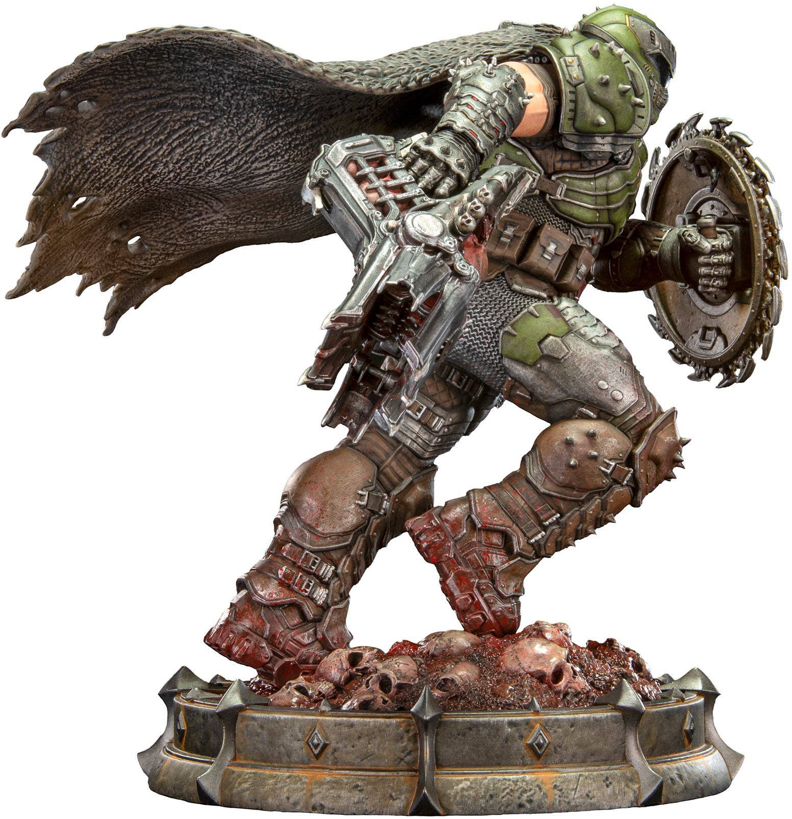 Dark Horse brings us an impressively detailed PVC display statue of the Doom Slayer from "Doom: The Dark Ages"! The Doom Slayer forges forward, his balance suggesting he may be struggling to walk into a strong wind, with his cloak flowing behind him; his pose allows us to appreciate every aspect of his armor, helmet, and weapons. The painstaking paint job brings out the mud and gore on his boots, the dull sheen of his mailed outfit, and the color of the skulls he walks across; even the base itself is carefully painted to resemble weather-beaten metal. Order this powerful figure for your own collection today!