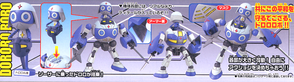 Simple snap-fit assembly kit of Dororo and his robot. Parts are molded in color and a sheet of stickers is included so no painting required to complete this kit. Get the rest of the Keroro platoon with their own robots and combine them to form the mighty Keroro Platoon Robo!