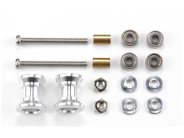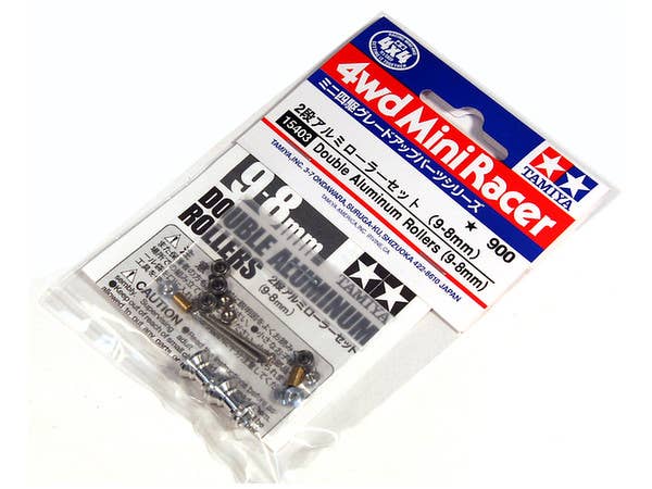 A set of double aluminum rollers (9-8mm) and mounting parts, for use with Tamiya's Mini 4WD Pro and Mini 4WD cars.