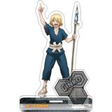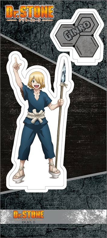 An acrylic stand featuring full color artwork of "Dr. Stone: Stone Wars" character Ginro with silver accessory pieces. Add this fun acrylic stand to your collection today, order now!