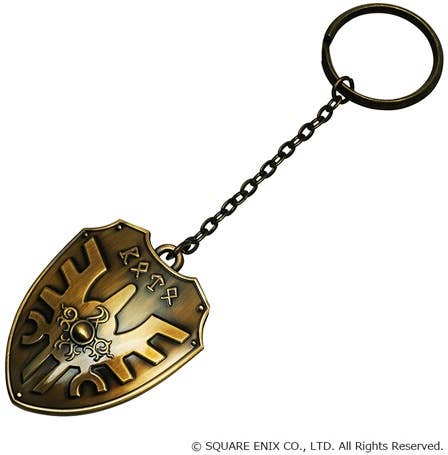Square Enix's metallic keychain of Erdrick's shield from "Dragon Quest" is back! It'll help keep your keys in line, and it'll also make it plain to all that you're a hero on an important quest. Its golden antique finish makes it look just like the real thing! Order yours today!
