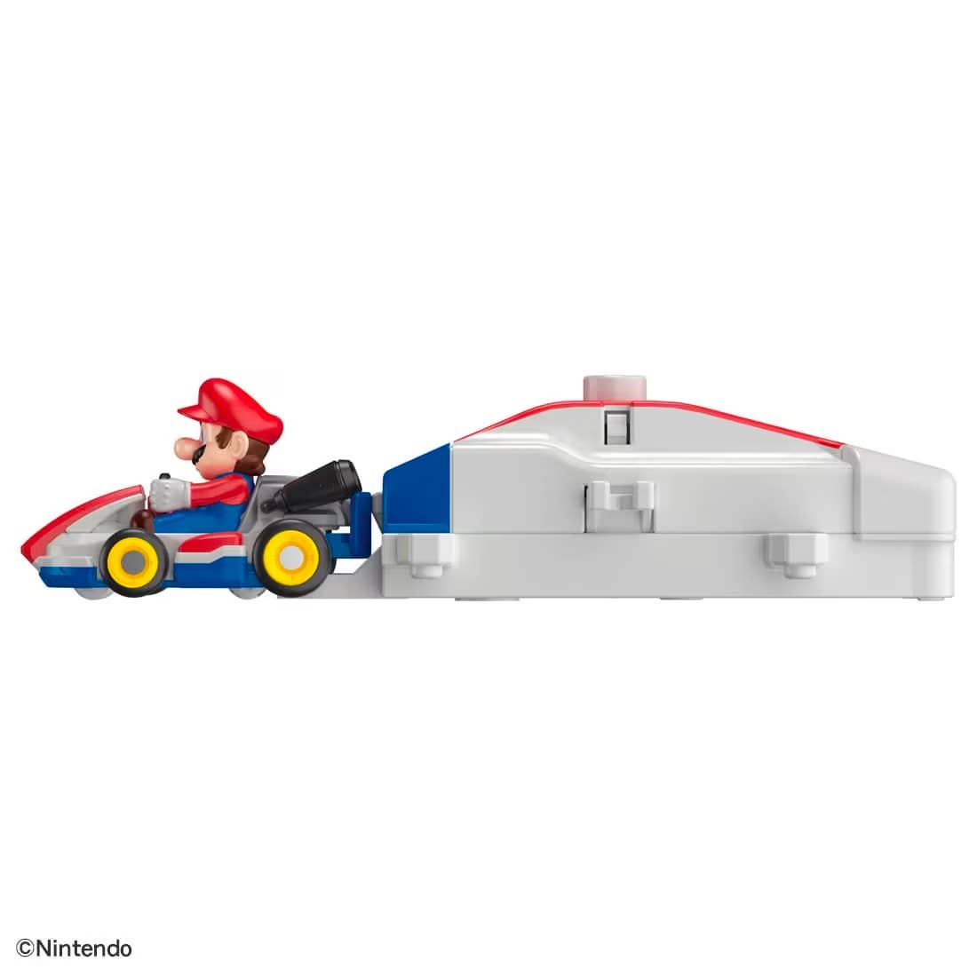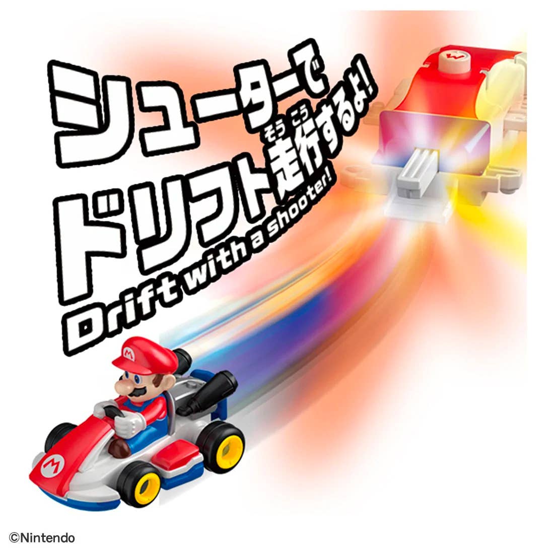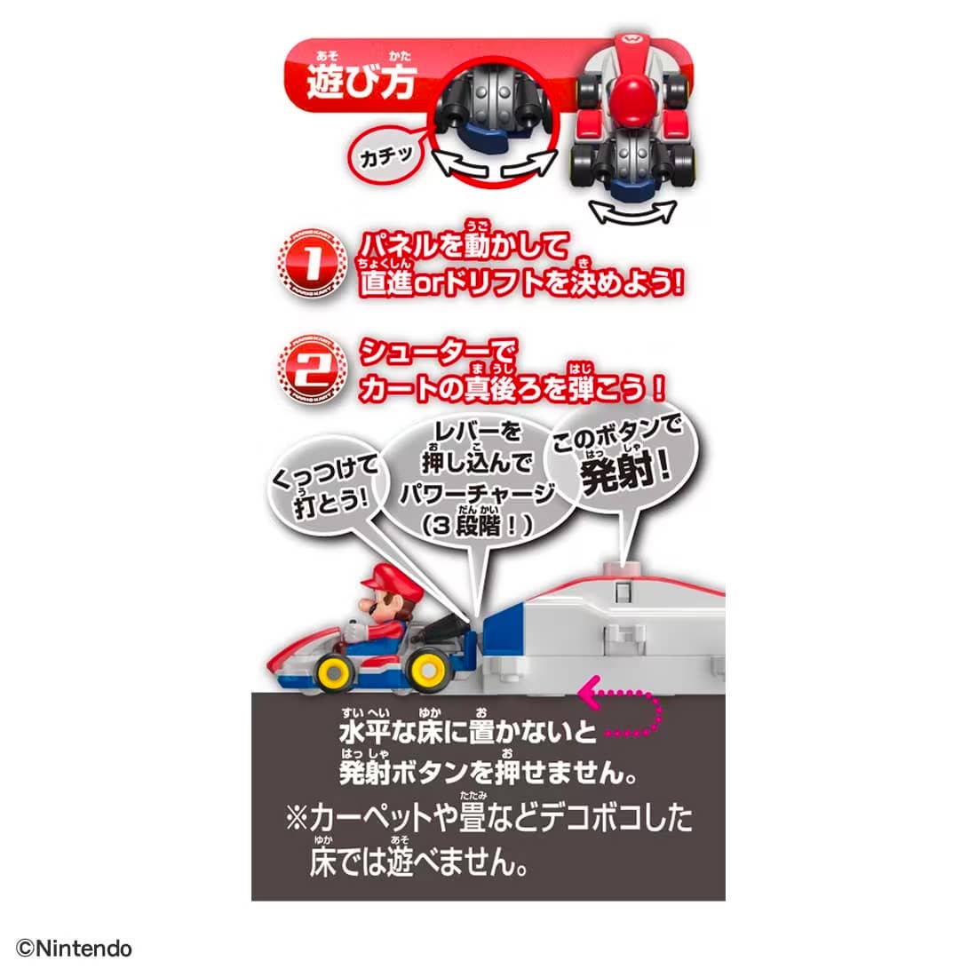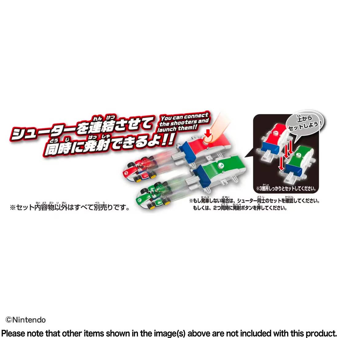 This set from Takara Tomy allows you to enjoy the world of "Mario Kart"! With the special wheels on the bottom of the vehicle and the included shooter, you can enjoy Mario in his standard kart drifting to the left, to the left, or going straight. There are three power levels, so you can enjoy a variety of rides! It's ready for play or display -- order yours today!