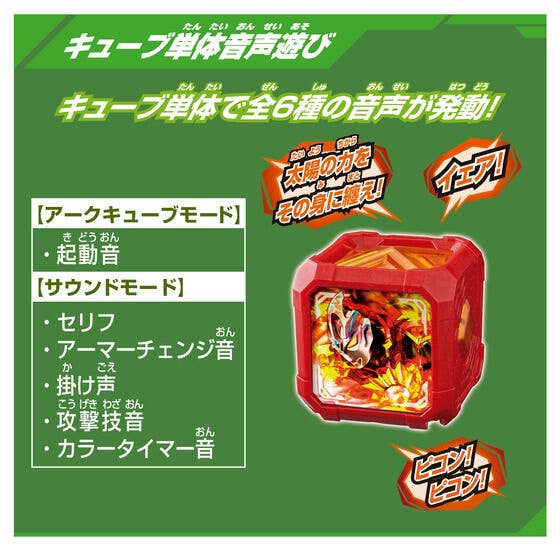 The cube can be enjoyed in standalone mode with a choice between "Sound Mode" and "Ark Cube Mode," each offering multiple sound effects. Additionally, it interacts with separately sold items such as the "DX Ark Ariser" and "DX Ark Iso Sword," activating exclusive sounds.