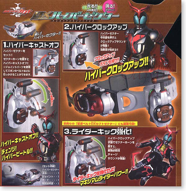 DX Hyper Zecter comes with an electronic Hyper Zecter toy that can produce lights and sounds, a joint part for attaching it to the Kabuto belt (sold separately), and a collectible card. Pull the horn downward to initiate "Hyper Cast Off" and change yourself into "Hyper Beetle." Hit the round "Clock Up" button to initiate ""Hyper Clock Up," and when in that mode, pull the horn downward to initiate "Maximum Rider Kick" to destroy your enemies!