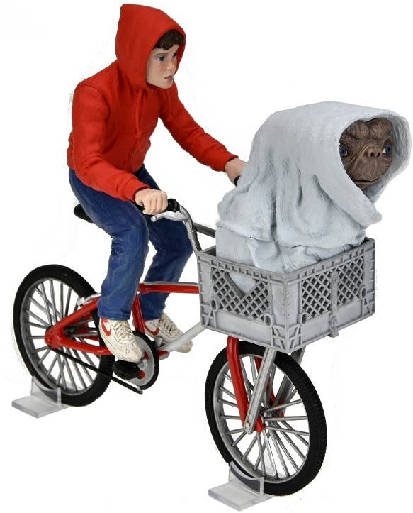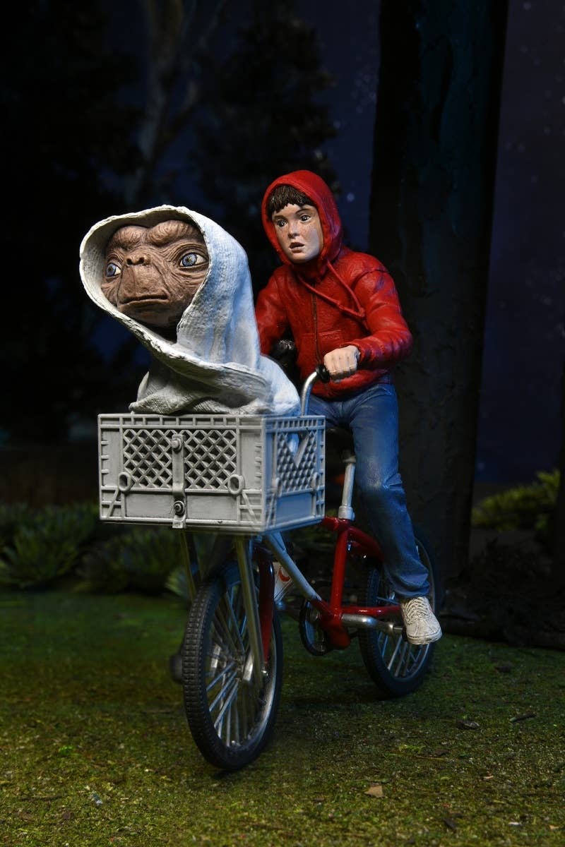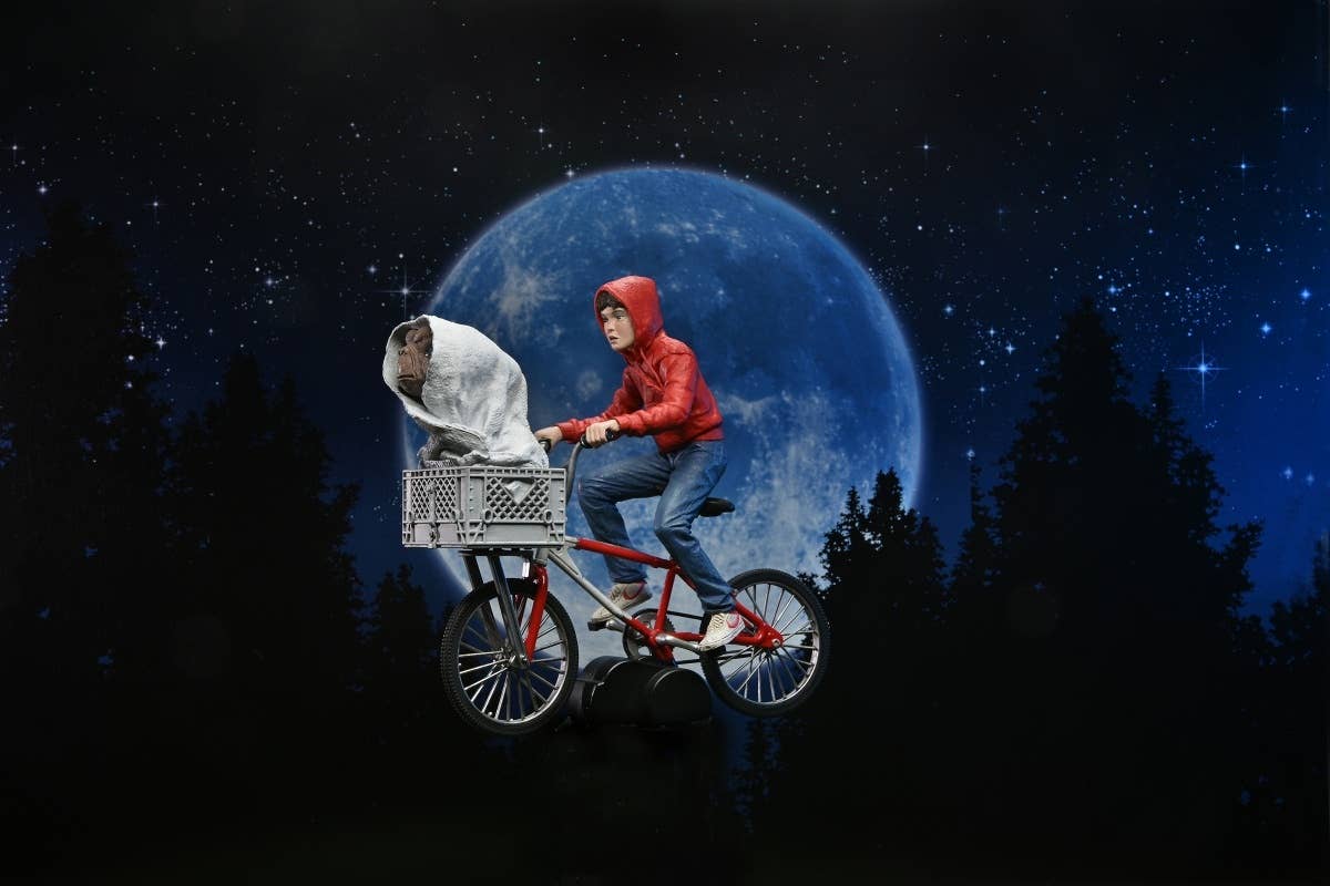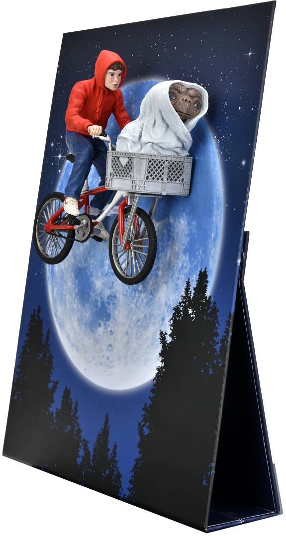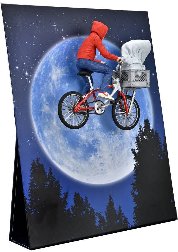 Celebrate the 40th anniversary of the beloved classic film "E.T." with this display figure set from NECA! As your friendship with E.T. grows, relive all of his earthly encounters, or look to the stars and create your own unforgettable interactive adventures. This amazing display figure of E.T. and Elliott on a bicycle features "pull-back-and-go" action! And a deluxe freestanding movie backdrop of the full moon is included that the figure can be attached to for an iconic image! Order this favorite character for your own collection today!