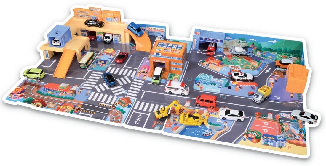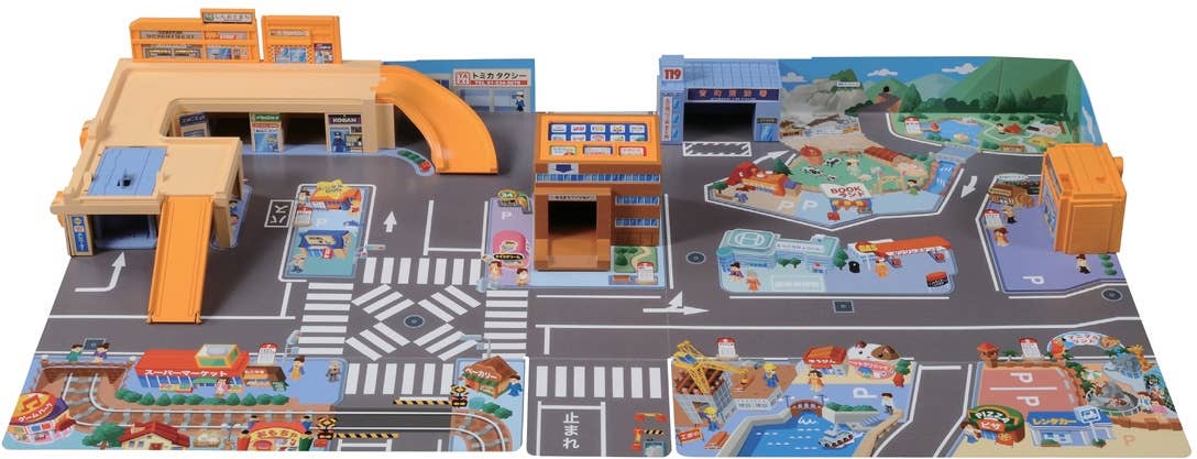 Tomica goes to town with this new release of the Easy to Clean Up! Lively Sound Town play set. Enjoy playing with the map's roads and building using Tomica cars (sold separately). Includes 13 switches which make various city sounds such as police cars and signals! After you are finished playing this set can be folded up for easy storage.