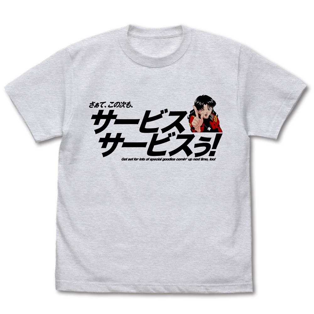 Misato Katsuragi from "Evangelion" promises "service service!" on this T-shirt from Cospa! Made from 100 percent cotton for maximum comfort and durability. Place your order today!