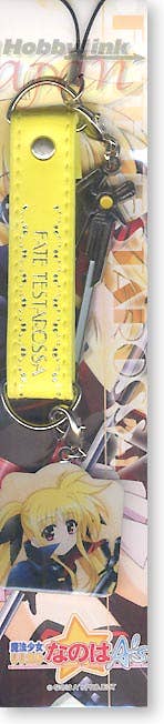 Very cool Fate cell phone strap with her full name "Fate Testarossa" printed on it and comes with her weapon made of metal attached to the strap. Also included is a metal plate with a nice picture of Fate printed on the front of the plate and attached to the strap.