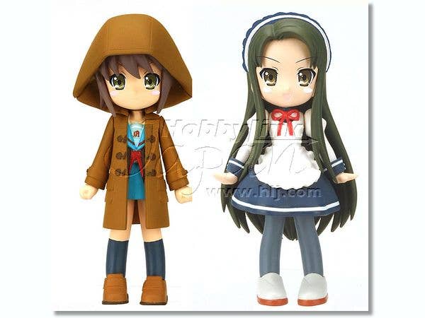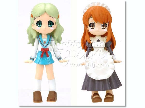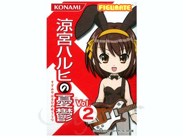 This second Figumate Haruhi series offers an assortment of adorable Figumate versions of characters from "The Melancholy of Haruhi Suzumiya" including Haruhi Suzumiya in bunny girl outfit (guitar and microphone included), Haruhi Suzumiya in sports outfit (rare item), Yuki Nagato in hooded trench coat, Mikuru Asahina in maid outfit, Tsuruya-san in waitress outfit, and Emiri Kimidori. That makes a total of six possible items to trade and collect! Each figure measures 8cm tall and comes with a display base. Sold by the randomly packed box of 10. Please note that these are trading figures and are individually sealed and randomly packed in boxes of 10 before shipment to HobbyLink Japan. As a result we are unable to honor requests for individual or specific figures, nor can we promise you which one(s) you will receive in a box. Please order only if you are willing to accept any of the possible types.