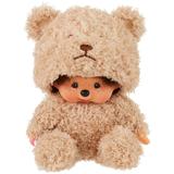 Here is Monchichi wearing a soft and fluffy color and texture stuffed animal.