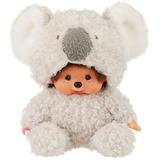 Here is Monchichi wearing a soft and fluffy color and texture stuffed animal.