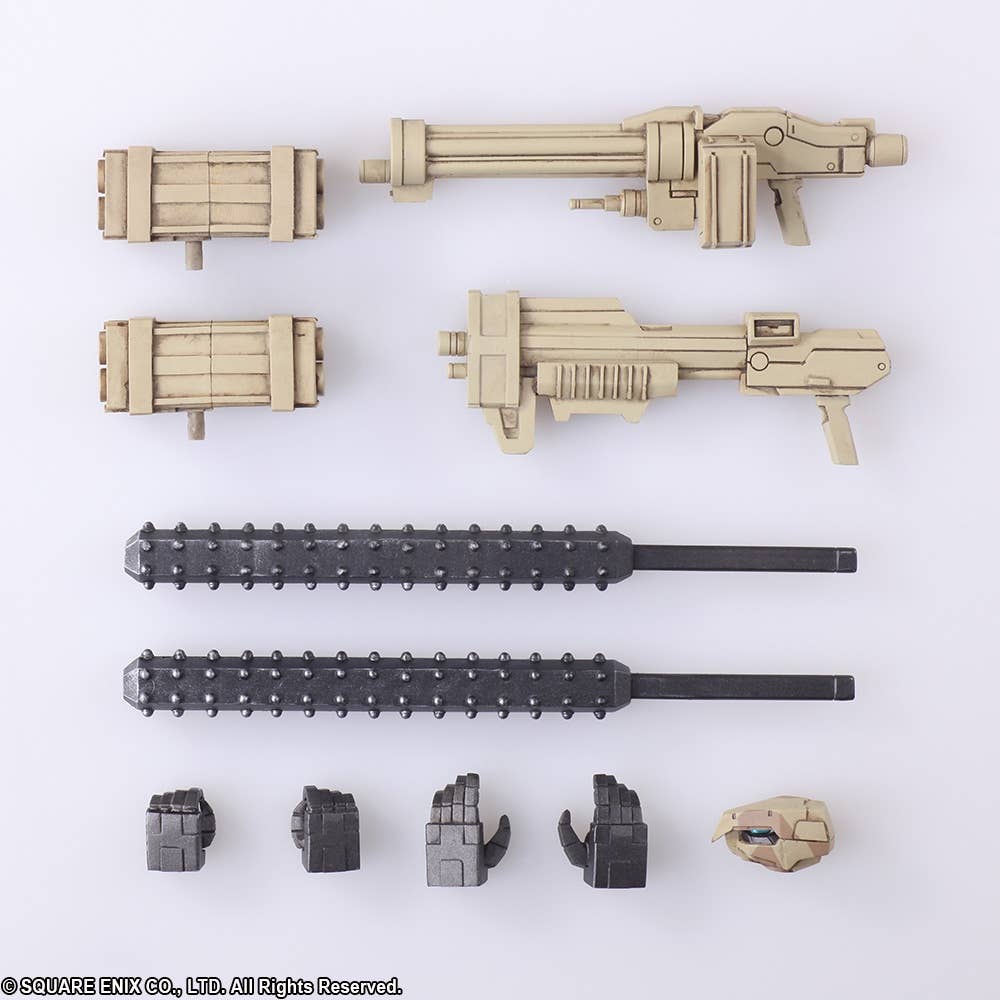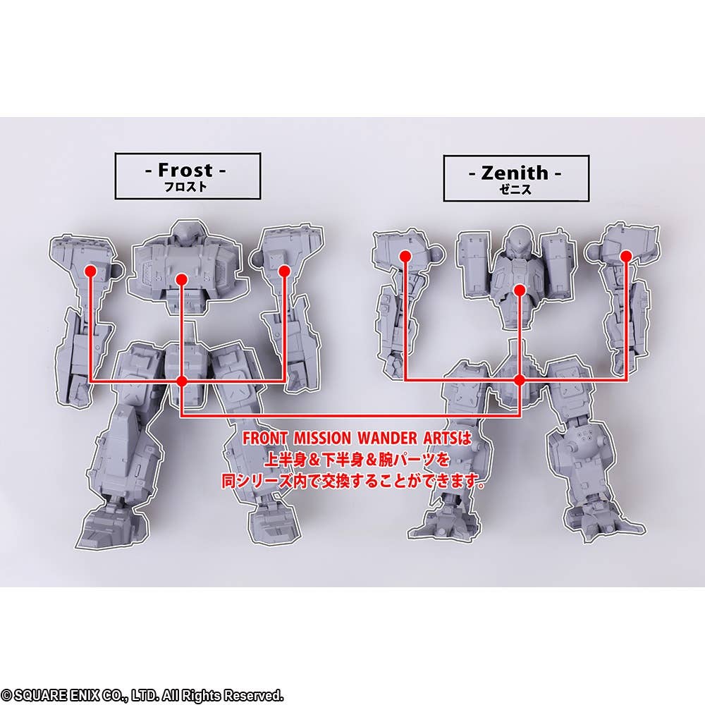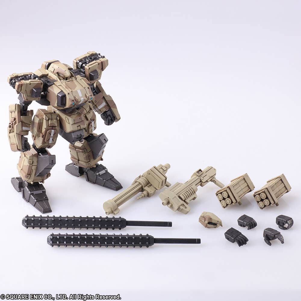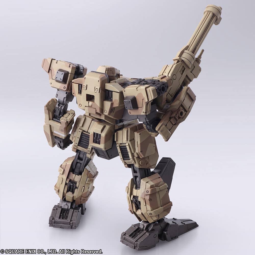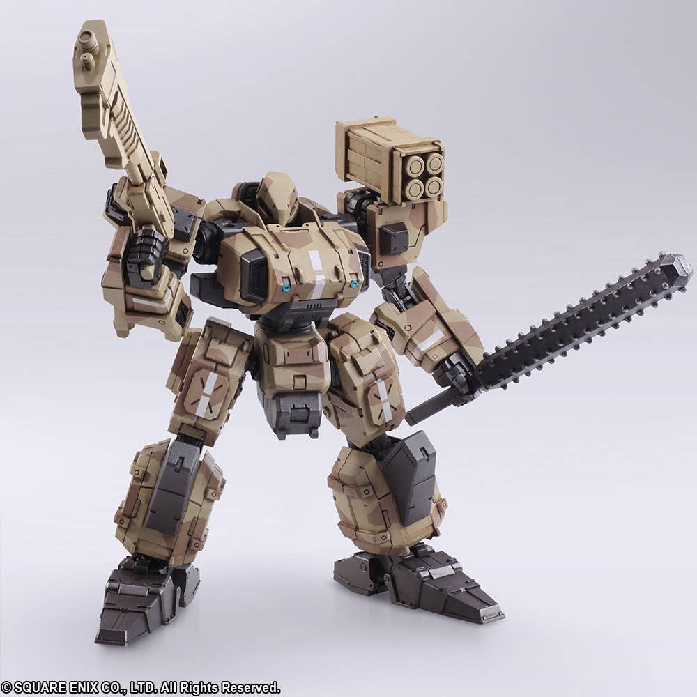 The Frost from "Front Mission First" in its desert camouflage version joins the Wander Arts action figure lineup from Square Enix! Its precisely sculpted mechanical form is equipped with special joints for highly flexible action poses; it can be freely customized with parts, armaments and accessories from other Wander Arts figures too, thanks to the 6 hard points equipped to its arms and shoulders. It comes with two interchangeable heads and four interchangeable hands, plus plenty of weapons. Order it today, and check out the Hell's Wall version too!