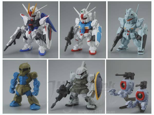 This is a series of gashapon (capsule toys) or trading figures depicting characters or mecha from the Gundam universe.