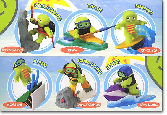 Great little trading figures of Gachapin performing various sportive actions: Aerial Jumping, Scuba Diving, Jet Skiing, Rock Climbing, Canoeing, and Surfing! Six figures plus colour variants, to trade and collect! Please note tha these are trading figures and are individually sealed and randomly packed in boxes of 12 before shipment to HobbyLink Japan. As a result we are unable to honour requests for individual or specific figures, nor can we promise you which figure(s) you will receive in a box. Please order only if you are willing to accept any of the possible types.