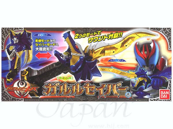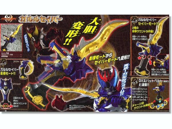 Summoned for Kamen Rider Kiva's use in switching to Garulu Form, the Garulu Saber begins in statuette mode and can then be transformed into a weapon by turning its curved blade upwards. Press the button located on the lower front of the weapon's hilt to play a "Howling Shock" sound; pressing the front trigger on the hilt will play two types of sword attack sounds. The mouth of the Garulu Saber can move to simulate biting when the back trigger on the hilt is pressed. Connect the bottom of the hilt to the DX Kivat Belt (sold separately) to play a charging sound. Two AAA batteries are required, not included.