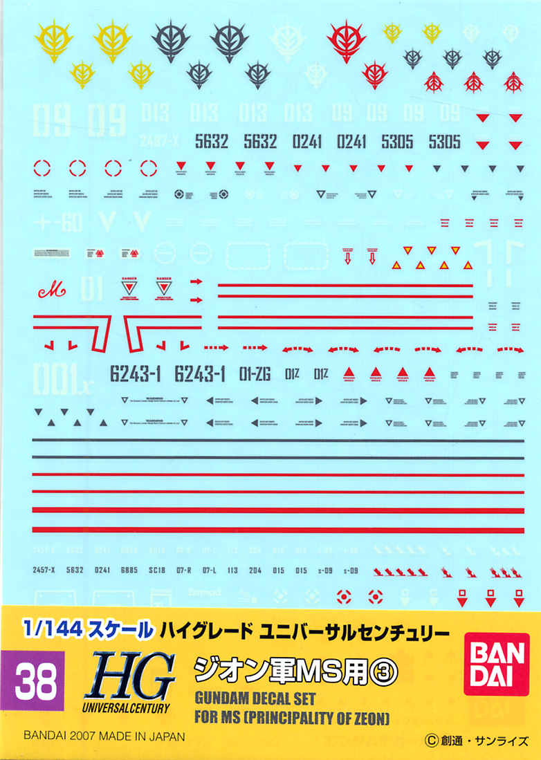 This sheet of water-slide decals is recommended for HGUC Dom/Rick Dom, Zeong, and Gyan model kits, and can be used with other HGUC Zeon MS model kits as well.