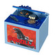 The Godzilla bank has a sea diorama design. When a coin is placed in the round wave atop the bank, Godzilla rises with an angry glow and pulls the coin inside with his left claw. The action is accompanied by Godzilla's famous roar and echoing footsteps, followed by the famous theme song (recorded from the master audio). There are 8 different randomly selected audio patterns.