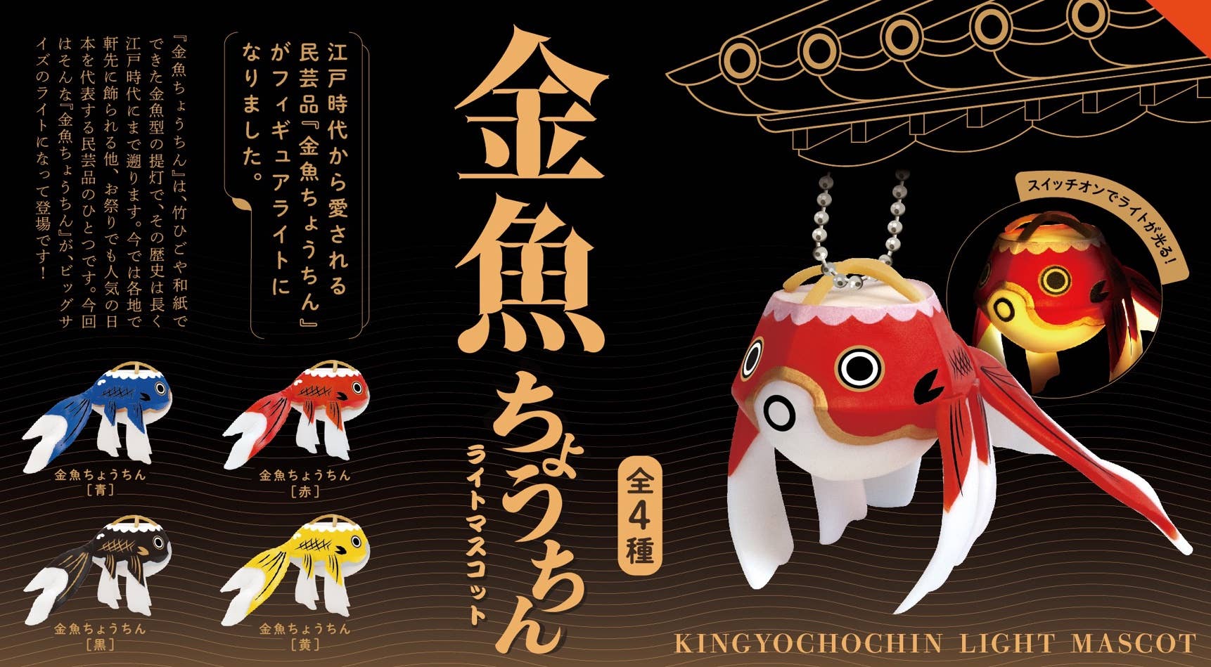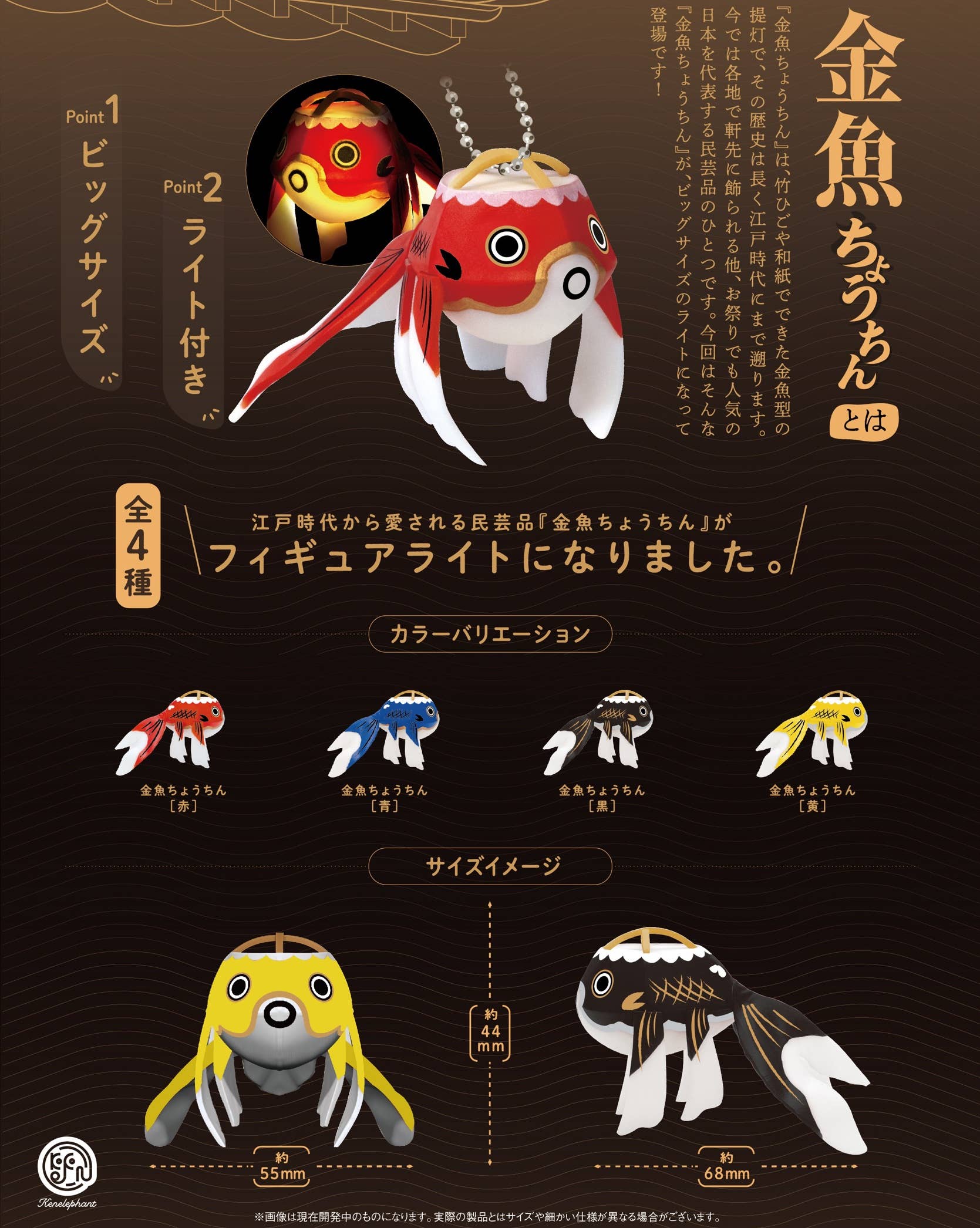 The folk craft goldfish lantern, which has been loved since the Edo period, is now a light-up mascot thanks to Ken Elefant! Each goldfish has a ball chain so you can take it with you everywhere you go, and they really light up, too! There are four different types, randomly packed in boxes of 12. Place your order today!
