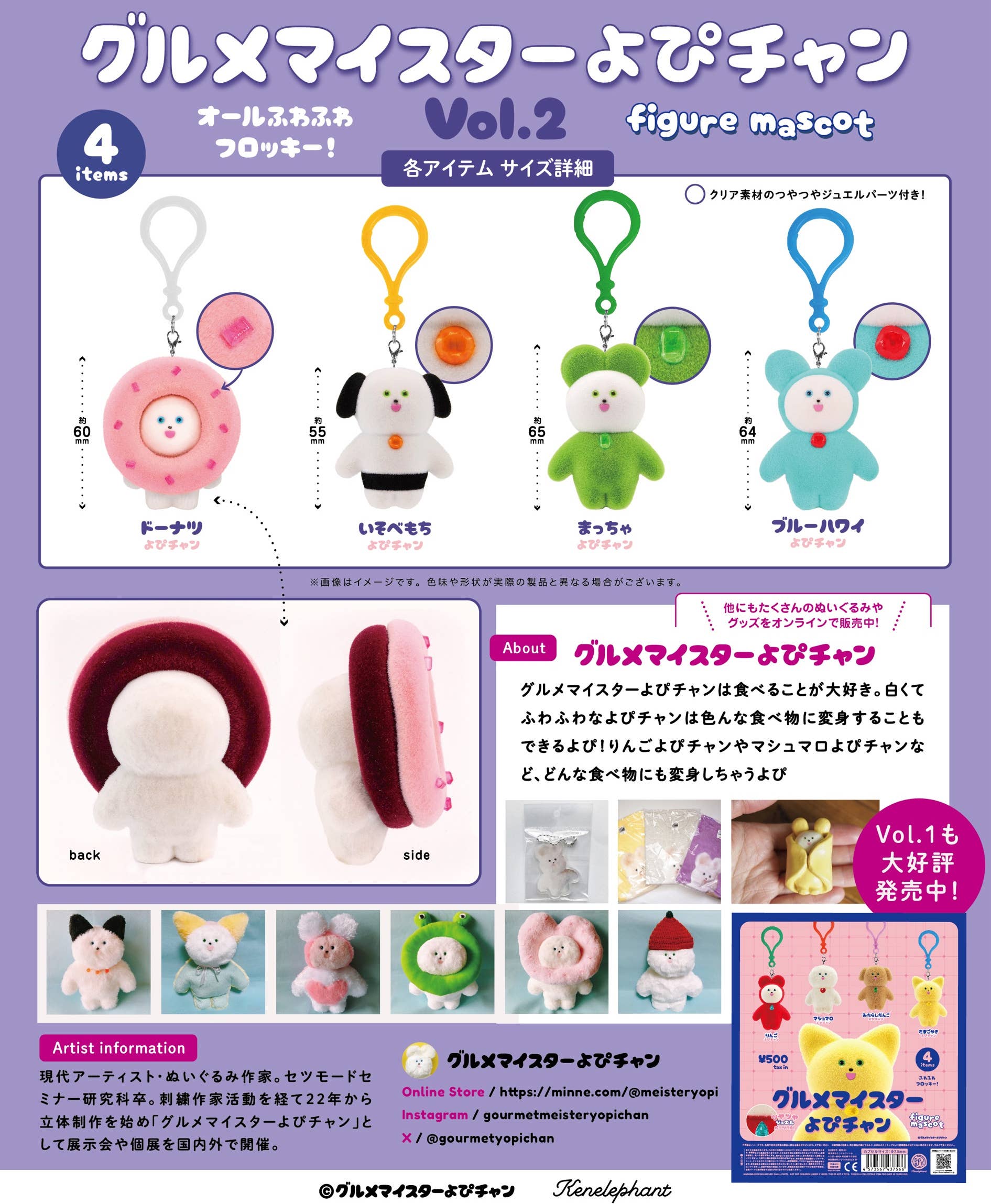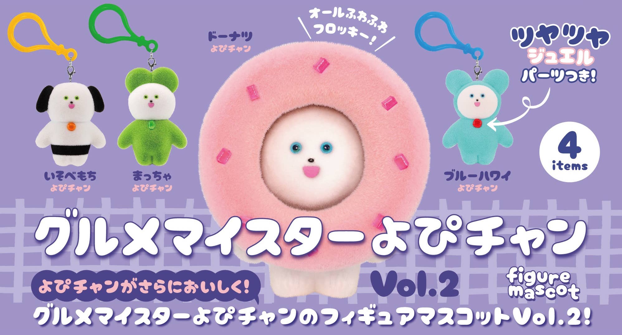 Ken Elefant brings us the second lineup of Gourmet Meister Yopichan's cute figure mascots! Each one comes with shiny jewel parts, and each one is flocked for a fuzzy feel; each is also connected to a carabiner, so they can be attached to your favorite backpack, bag, or purse. There are four different mascots to collect and trade, randomly packed in boxes of 12. Order yours today!
