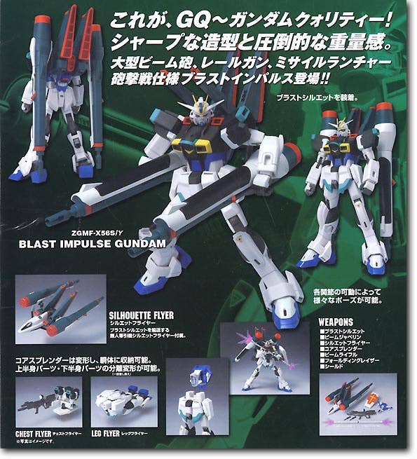 More than a handful of fun, the GQ (it stands for "Gundam Quality") Model Blast Impulse Gundam is a "Metal Material" (Chogokin) model, with a super-heavy metal core that makes it feel sturdier than most plastic models. The base model is the Blast Impulse Gundam (snap the parts together), but extra equipment included lets you arm it impressively with the Blast Silhouette, Beam Javelin, Silhouette Flyer, Core Splendor, Beam Rifle, Folding Laser and shield. Spare hands make weapon manipulation fun!