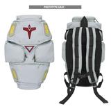 The radiator shield used by Gundam GP02 in "Gundam 0083: Stardust Memory" is now a large-capacity backpack from Cospa! Inspired by the shield's unique characteristic shape, this backpack maximizes practicality while looking incredibly awesome! It's approximately 140 percent larger than Cospa's previous cross-body bags. The distinctive red mark is made of synthetic leather for a luxurious feel, and the refrigerant discharge ducts in four places are also reproduced. Metal tacks reproduce the fine details, and it's made of a highly durable fabric. In addition to the main storage compartment, seven pockets can be used for various small items; four of the pockets feature double fastener specifications, and the accessory case on top is perfect for your smartphone. The top of the central pocket has a Velcro closure to prevent items from falling out, and there are two side pockets that are the perfect shape and size for PET-bottled drinks! The main compartment has a drawstring closure, and has two inside pockets. It can hold items as large as a 13-inch laptop or tablet! This pack can be carried on your back with the chest strap across your body, which helps reduce the load when carrying a lot; earphone pouches and carabiners can also be attached o the shoulder strap. It's useful and looks amazing, too -- order yours today!
