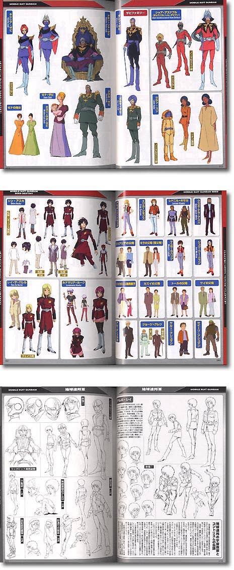 This enormous book is a genuine encyclopedia of Gundam characters, from the original Gundam series through Gundam SEED Destiny and even some of the video games. Colour illustrations are included in the front, but all the information is accompanied by black and white art. 506 pages, soft cover. All text is in Japanese.
