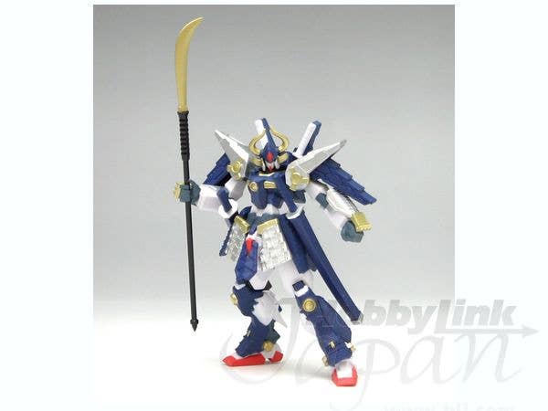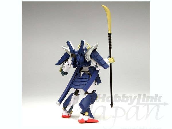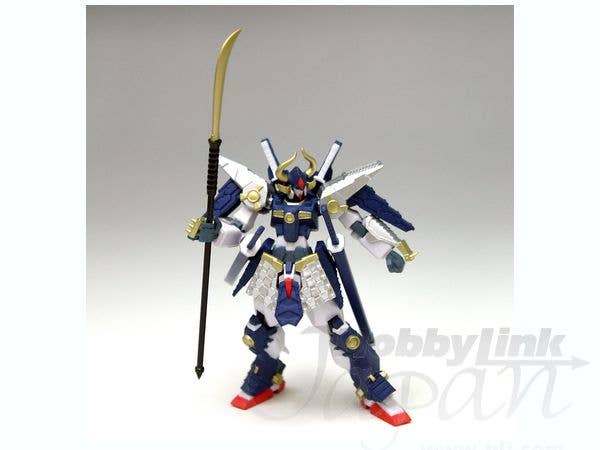 Part of the "Musha Go-nin Shuu: Kaze no Maki Sora no Maki" lineup in Banpresto's Kiba-Musha Den game-prize series, this action figure is a slight repaint and improvement over the 2008-released Musha Mk-II , now with white sword handles on its backpack and an additional naginata weapon. This nicely detailed samurai-style Gundam action figure comes in prepainted parts and will measure 10cm tall after you pop them together. Musha Mk-II can be equipped with the included naginata weapon and two katana, which can be stored in its sheaths. Four optional hands are provided. Please note that the photos shown are of a prototype; the production version may vary.