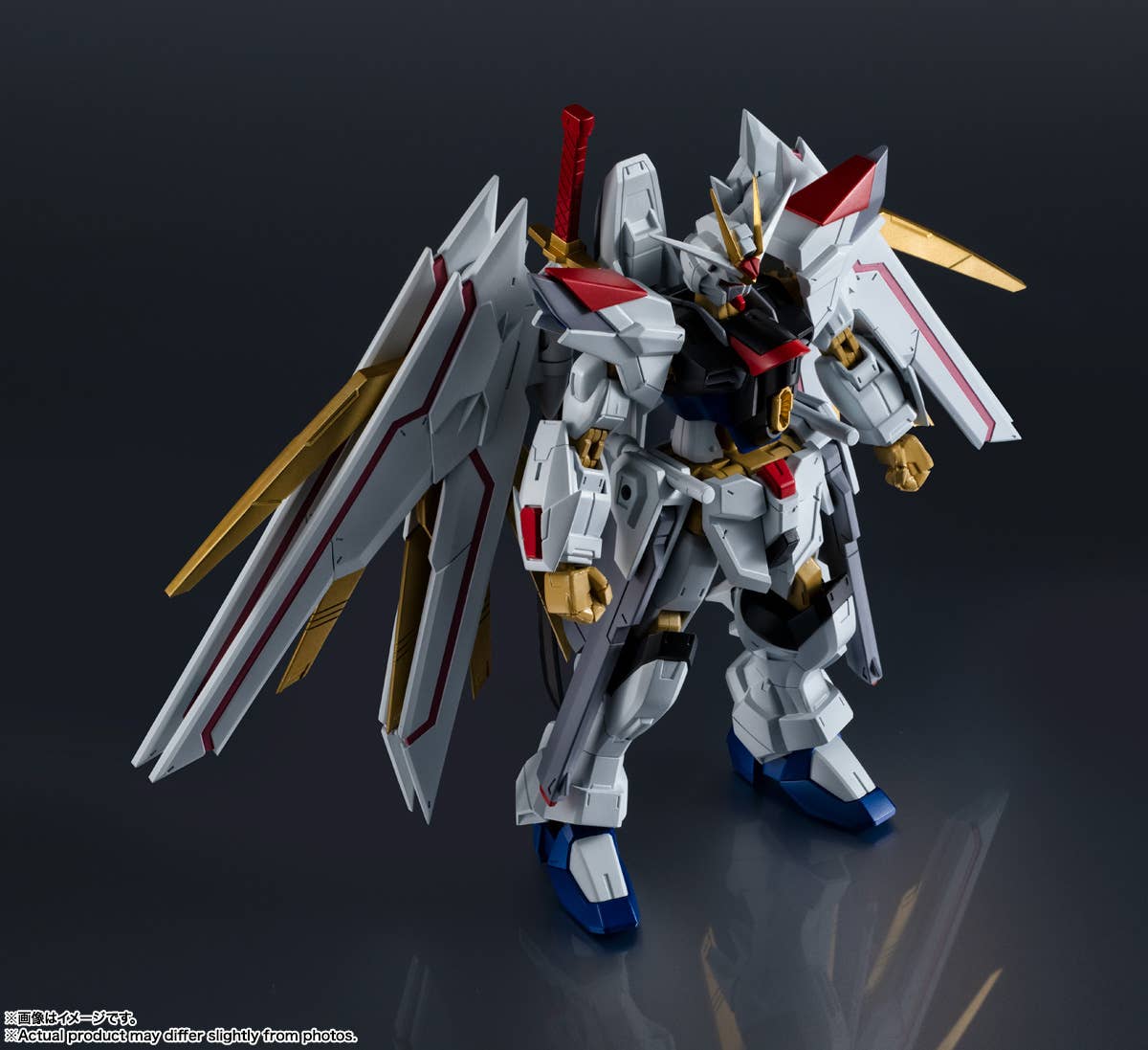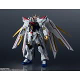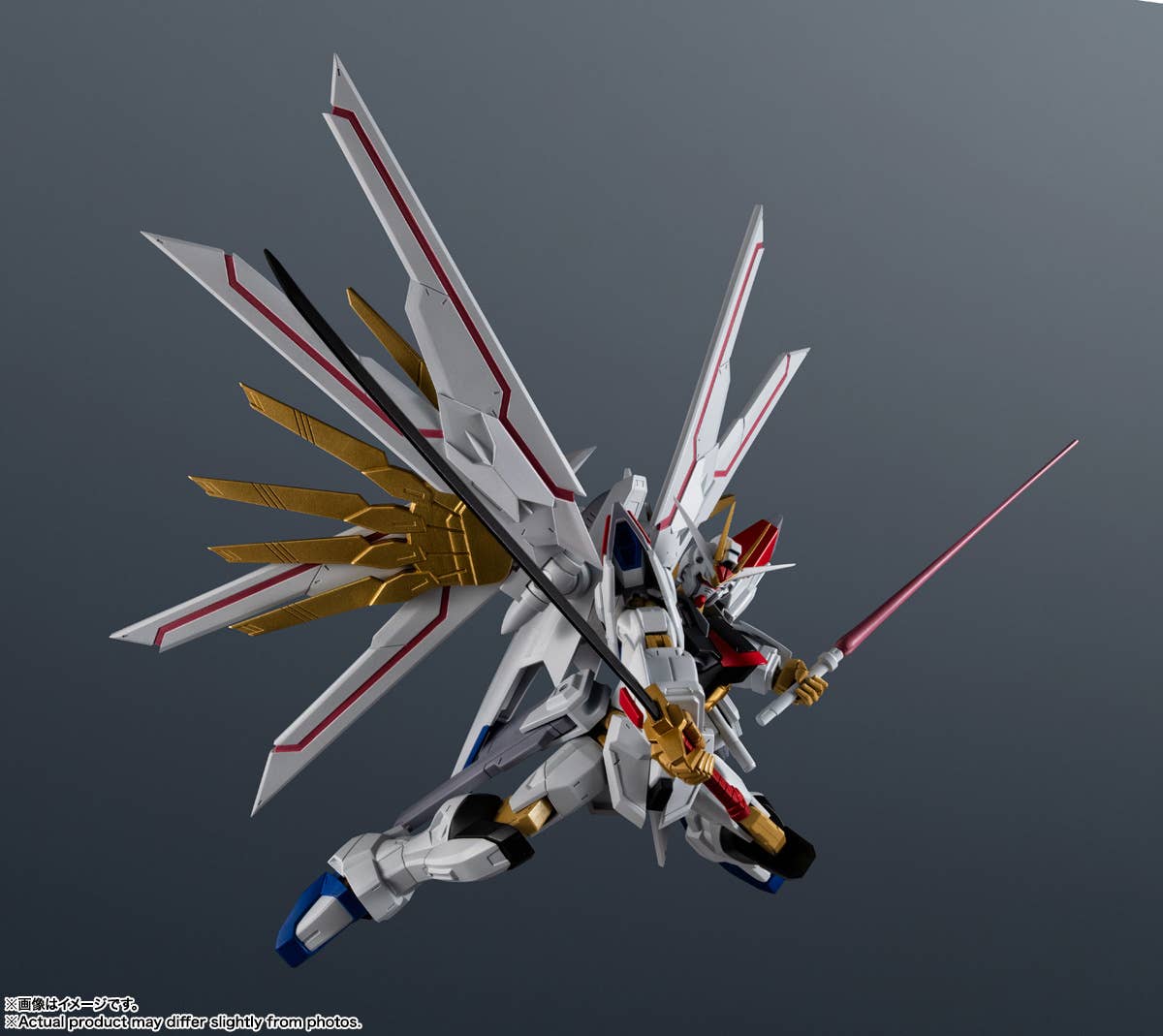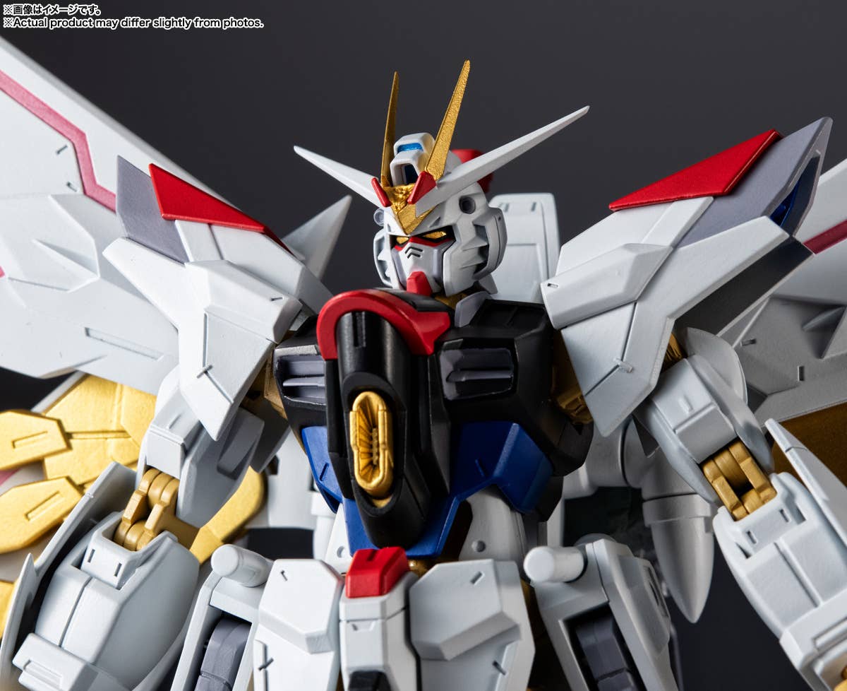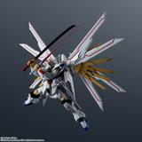 The Mighty Strike Freedom Gundam, which played a major role in "Mobile Suit Gundam Seed Freedom," is joining the "Gundam Universe" action-figure series from Bandai! It's built on a Universal Reaction Frame to achieve an optimal range of motion for ease of play, so you can recreate all your favorite scenes from the series! Its distinctive stylish design has been carefully reproduced; the backpack can also be displayed as a Proud Defender by using the included joint (requires a Tamashii Stage, sold separately). The beam saber and the anti-ship sword Futsunomitama are included, as are interchangeable antenna parts to recreate the Disruptor firing mode. Order yours today!