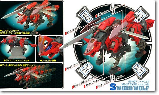 The Sword Wolf snaps together and requires no paint or glue for assembly; an electric motor powers its forward action (requires 1 AA battery, not included). A pilot figure and a display stand are included as well.