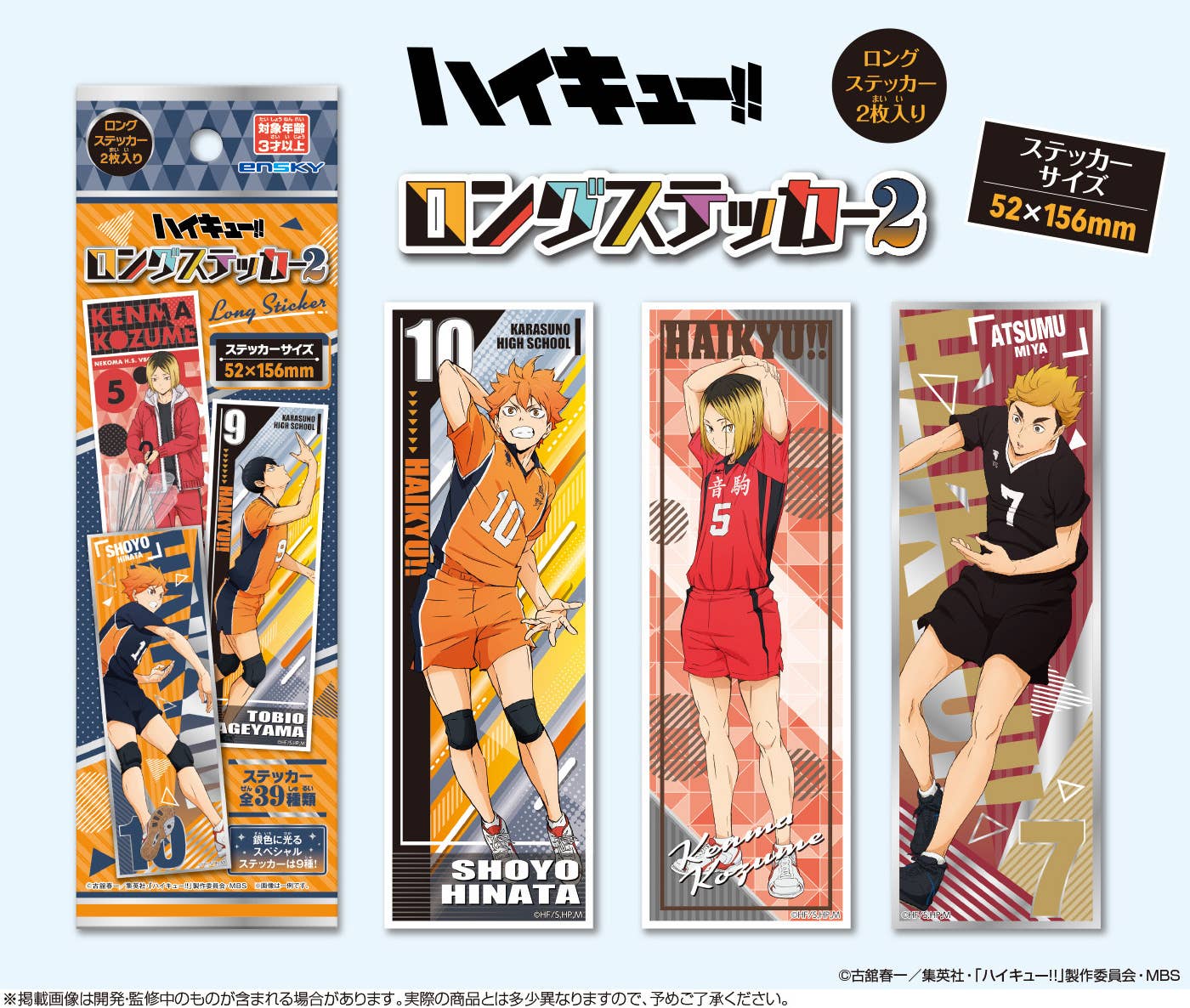 Ensky brings us their second lineup of long stickers from "Haikyu!!" There are 30 normal stickers and nine special stickers in the lineup; the special stickers feature a metallic silver finish for an extra gleam! The box contains 20 randomly-chosen packs, and each pack contains two randomly-selected stickers; there are a total of 39 different stickers to collect and trade. Place your order today!