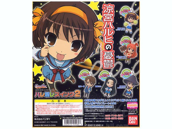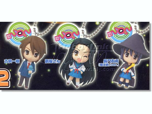 Cute line of gashapon swings featuring adorable SD figures of popular characters from "The Melancholy of Haruhi Suzumiya." The lineup consists of Haruhi Suzumiya (cheer girl version), Mikuru Asahina (bunny version), Yuki Nagato (magician version), Tsuruya-san, Itsuki Koizumi, and a color variation of Mikuru Asahina, for a total of six possible items to trade and collect. Sold by the randomly-packed assortment of 10. Please note that these are gashapon figures, and are individually sealed in their plastic "eggs" and randomly packed into boxes of 10. As a result we are unable to honor requests for individual or specific figures, nor can we promise you which figure(s) you will receive in a box. Please order only if you are willing to accept any of the possible types.