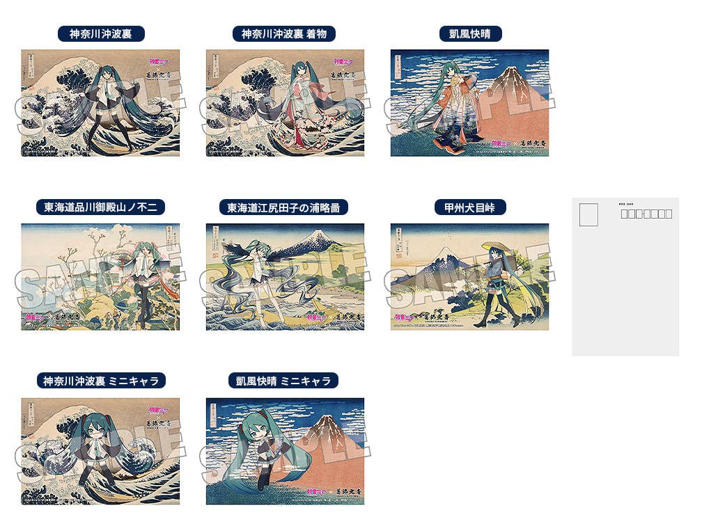 This special collaboration features art by the illustrator iXima, depicting Hatsune Miku within the world of some of Hokusai's most famous images! Miku dances with the waves seen in "A Sketch of tago Bay at Ejiri on the Tokaido" on this postcard -- use it to write messages to anyone you like, frame it, or display it as part of your collection! Place your order today!