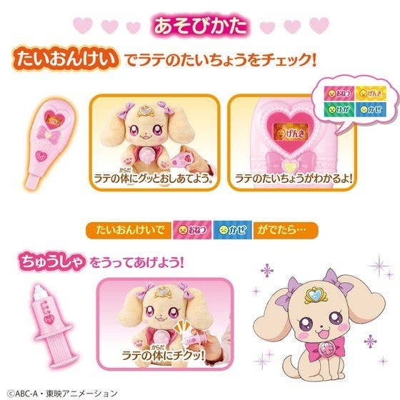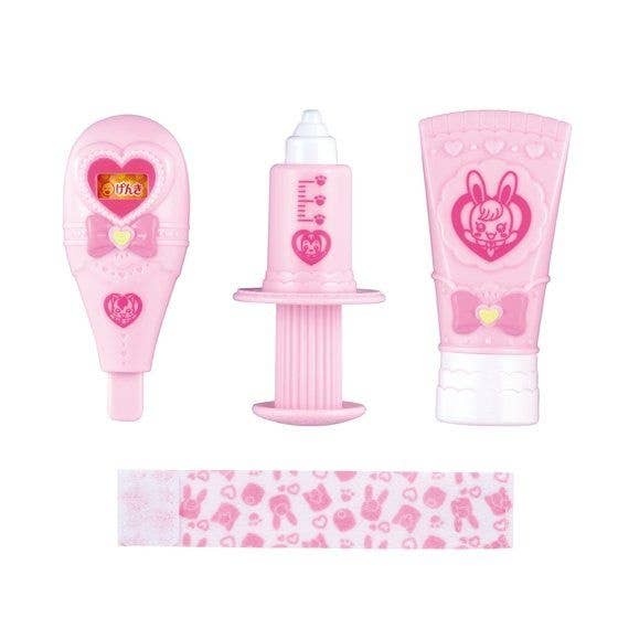 Care for your "Healin'Good Precure" Stethoscope de Pi Talking Latte plush doll (sold separately) even more with this accessory set! It comes with a thermometer, an ointment bottle, a syringe, and a bandage for when your little Latte is hurt or feeling sick.