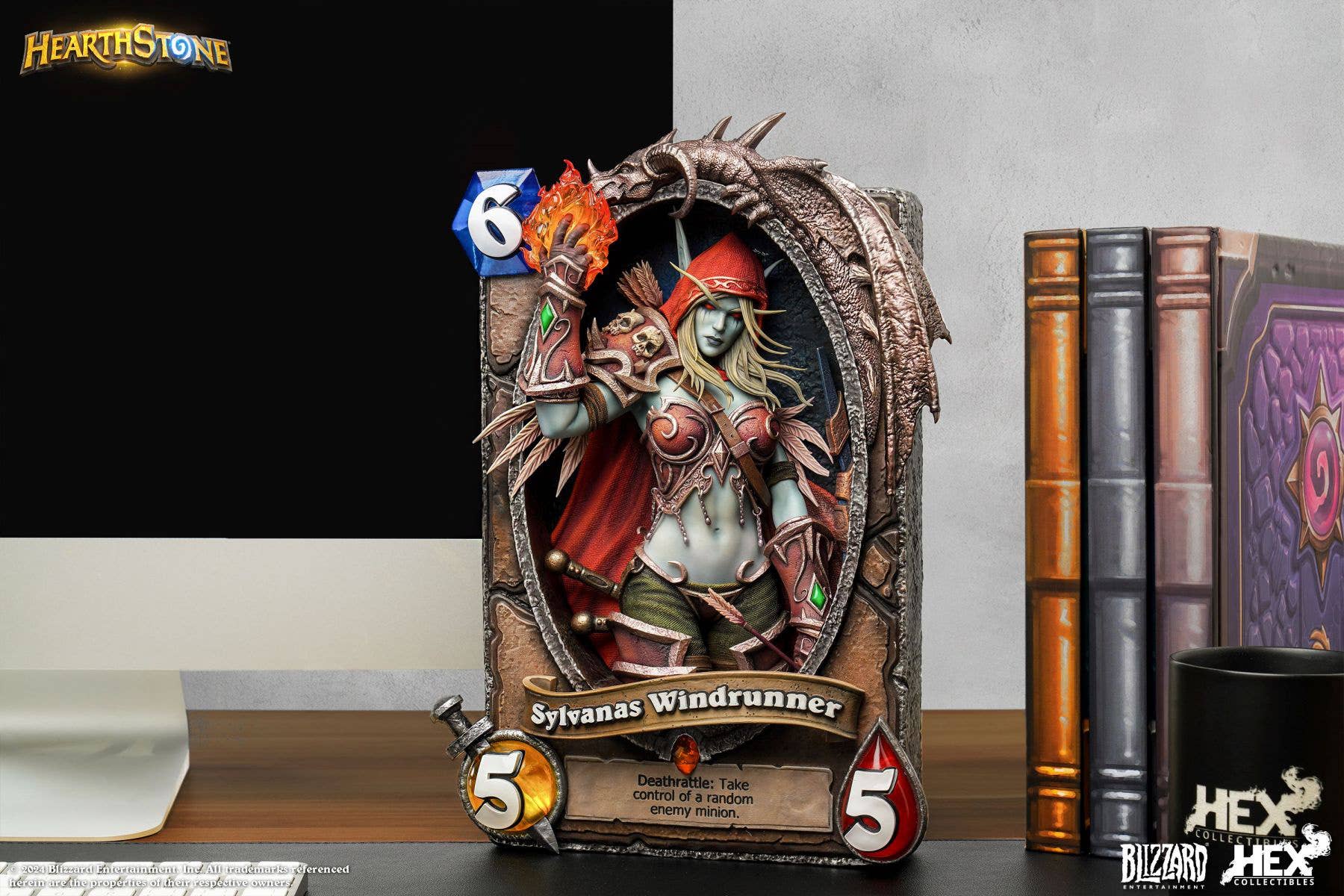HEX Collectibles brings us a special item to commemorate the 10th anniversary of the popular card game "Hearthstone," brought to us by Blizzard! The legendary card Sylvanas Windrunner has now been made into an amazing 3D art frame for your collection! She has a rather disdainful expression on her face and a powerful dark aura; she's been sculpted and painted in incredible detail, down to the trim on her armor and the bright flame erupting from her right hand. A removable stand attaches to the frame's back so you can display it on a tabletop, and there are also two special hanging hooks in the center of the back, so it can be hung on the wall if you prefer. You'll be proud to show off this incredible collectible -- place your order today!