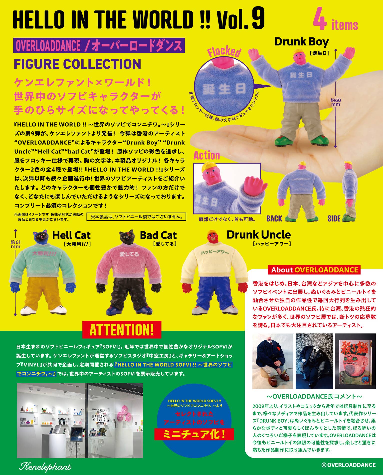 Ken Elefant's "Hello In The World!!" figure lineup brings us soft-vinyl characters from all over the world! This new lineup features four characters created by the Hong Kong artist Overloaddance! The coloring of each character has been faithfully recreated, with their clothing flocked for a fuzzy feel! The lettering on the chest of each character is original to this product, and the shoulders and neck are movable too. The figures are randomly packed in boxes of 12. Order yours today!