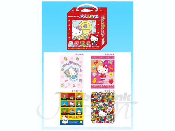 Four different Hello Kitty puzzles are packed inside a handy carrying box! Each puzzle has a different piece count--15,35, 54 and 80 pieces. They're lots of fun for anyone!