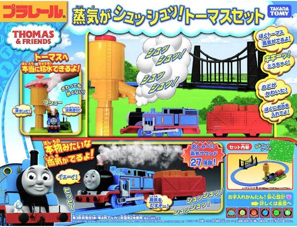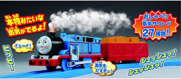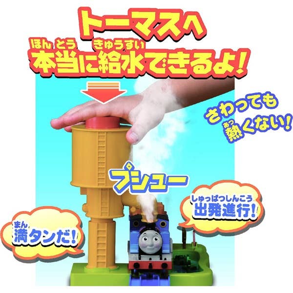 Thomas will chug around the track loop with steam billowing from his chimney, and if he runs out, you can stop him at the water tank for a refill. The set also features 27 sounds and phrases in Japanese. When steam is running low, Thomas will say phrases like "I'm thirsty," or "Fill me up!" And when his tank has been filled with water, Thomas will say, "All filled up!," or "Ready for departure," when he sets off from the water tower.