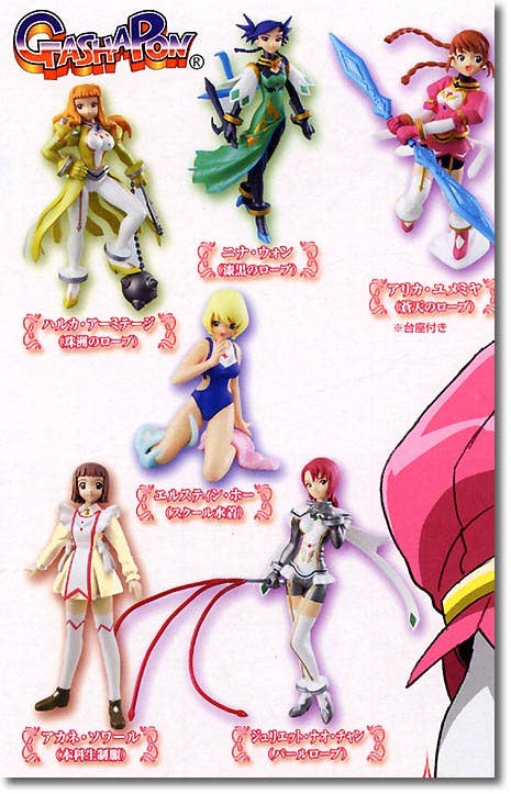 Beautiful second series of gashapon figures featuring the girls from Mai-Otome includes: Haruka Armitage, Nina Wong, Arika Yumemiya, Elstein How, Akane Soware, and Juliette Nao Chan. Please note that these are gashapon toys and are individually sealed inside their plastic "eggs" and randomly packed in boxes of 10 before shipment from HobbyLink Japan. As a result we are unable to honour requests for individual or specific toys, nor can we promise you which one(s) you will receive in a box. Please order only if you are willing to accept any of the possible types.
