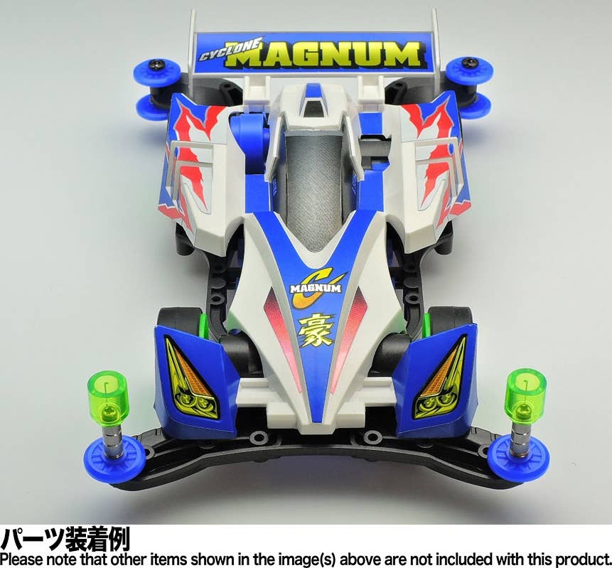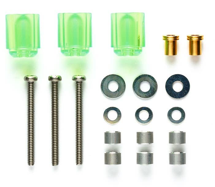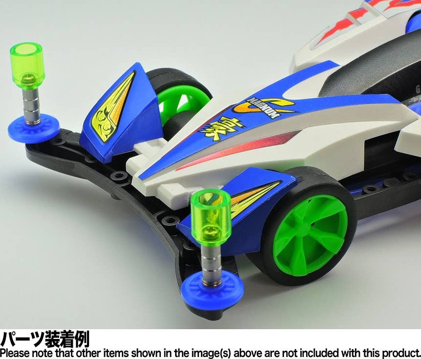 This hi-mount tube stabilizer set comes in clear green and includes all the metal parts you need for installation. Made for use with Mini 4WD pro and Mini 4WD cars.