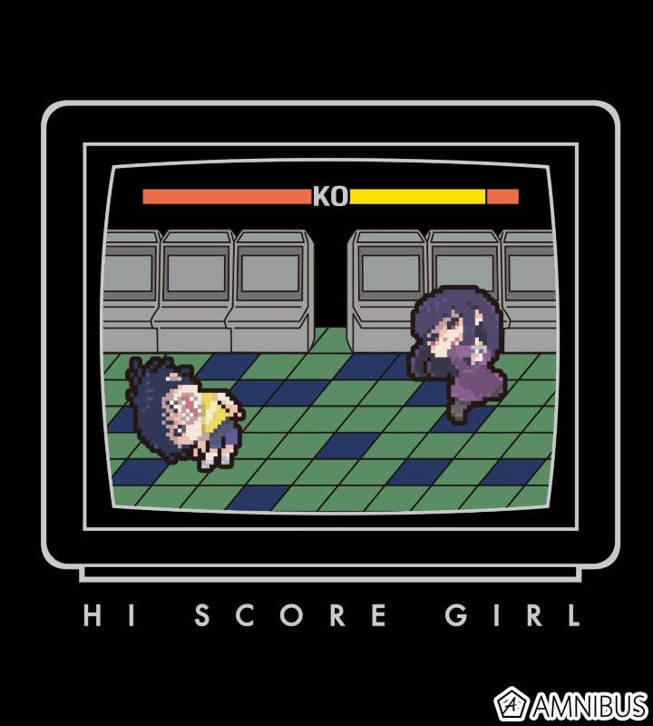 Fans of "High Score Girl" will love this brand new T-shirt! This black T-shirt features fun, 8-bit style artwork of Haruo and Akira in a retro style fighting game! This shirt makes for an excellent addition to any fan's wardrobe, order today!