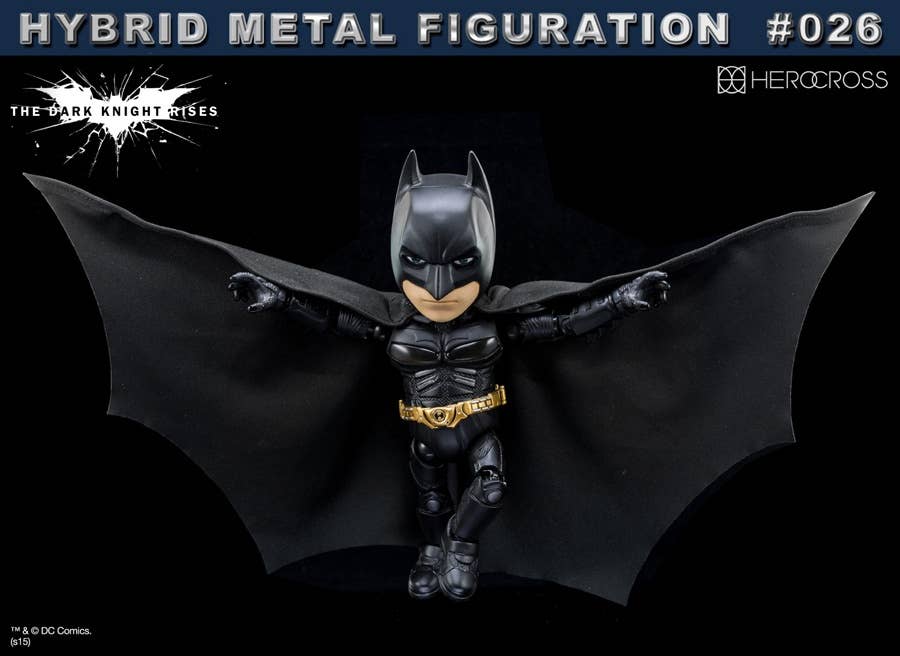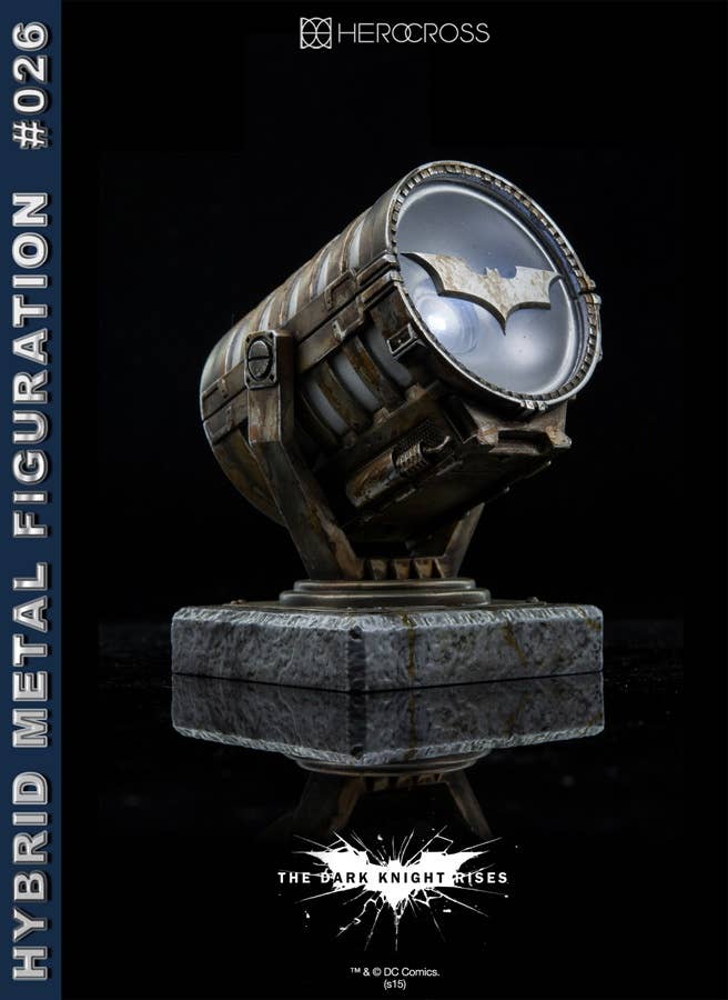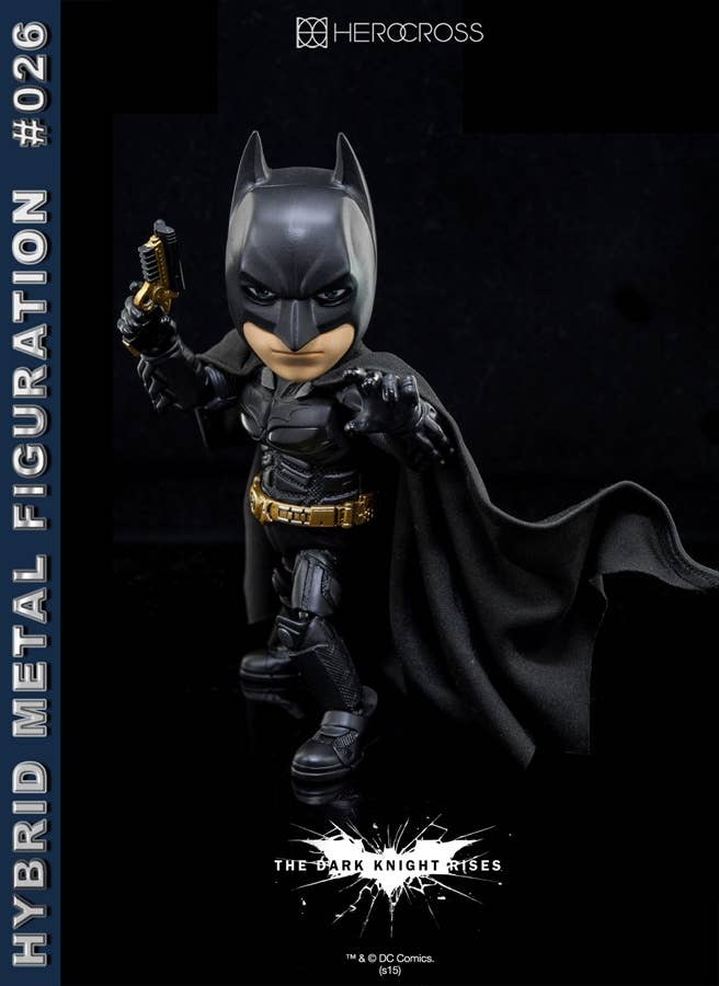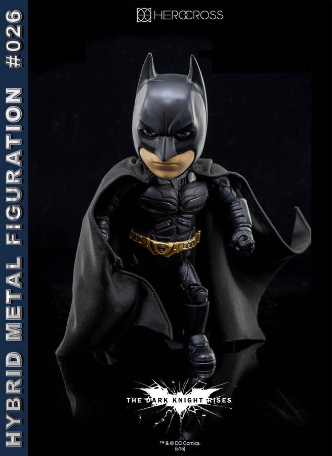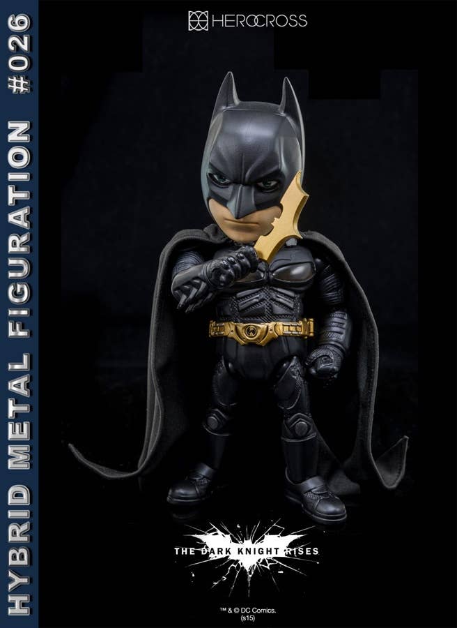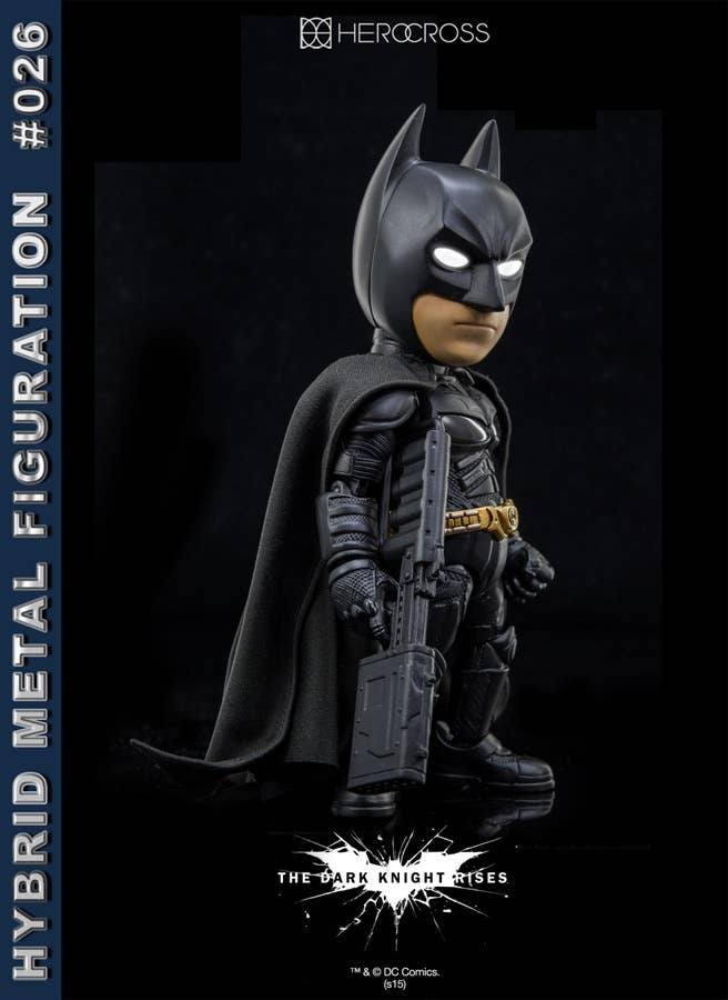 Batman from the theatrical film "Batman: The Dark Knight Rises" gets the Hybrid Metal Figuration treatment from Herocross! Standing about 14cm tall, this super-posable Batman (boasting over 20 points of articulation) comes with two interchangeable faces--one with normal eyes, and the other with Bat-Sonar lenses that light up! He also has his batarang, grapnel gun and an E.M.P. blaster, and a total of 7 interchangeable hands to assist in holding them. Best of all, there's also a light-up Bat-Signal that can project the Batman logo onto your own ceiling anytime you like! (Button-cell batteries are required for the light-up features, and they're not included.) This iconic hero deserves a place in your collection--order him today!