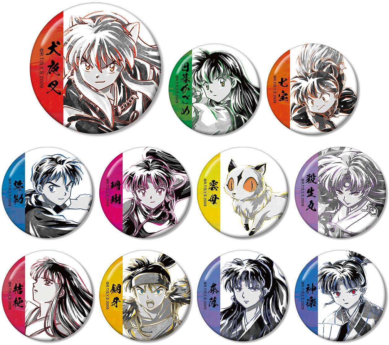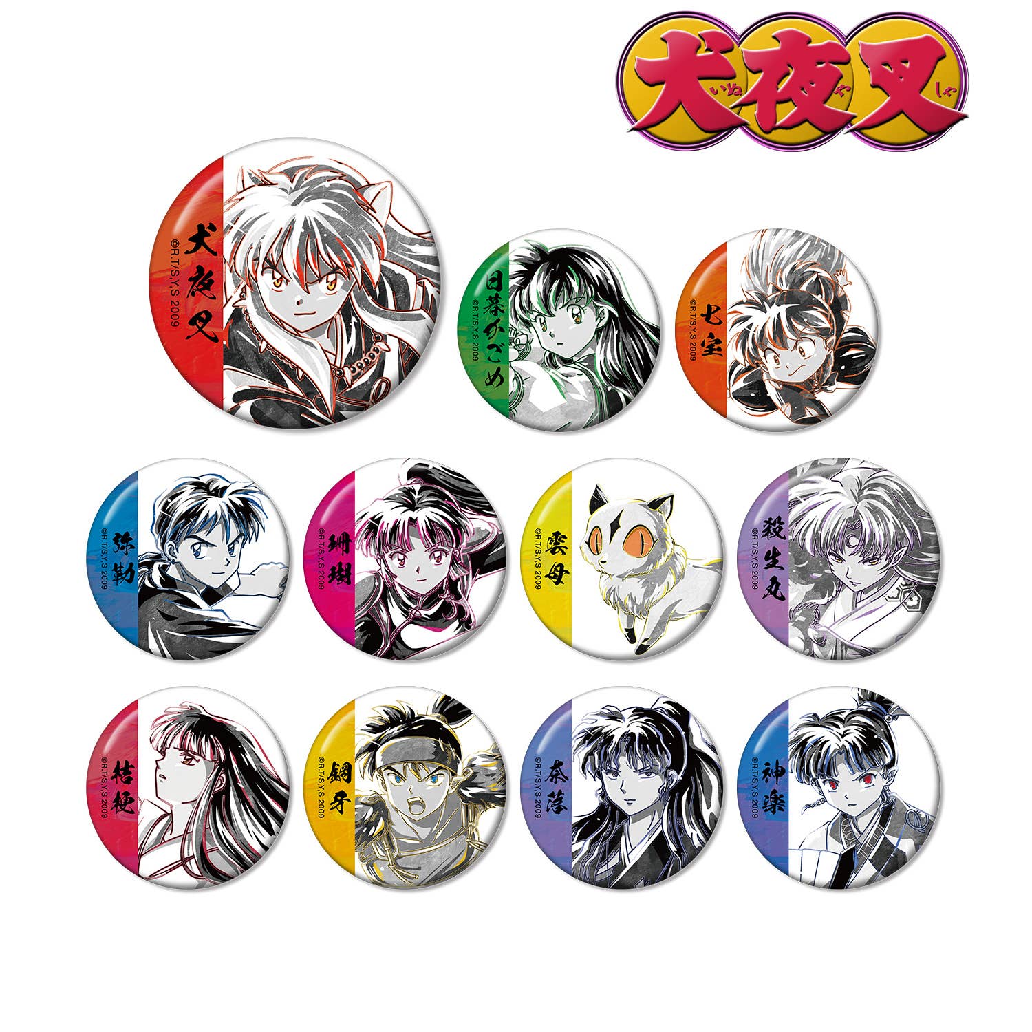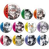 Each box contains 11 unique can badges selected at random featuring characters from the Inuyasha series. Designs include the following characters: