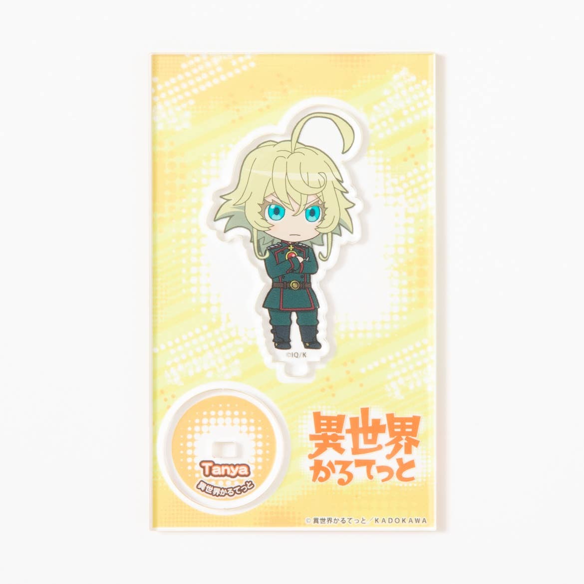 Acrylic figures are display pieces that stand up on your shelf! This one features Tanya von Degurechaff from "Isekai Quartet," and includes a round base with the character's name for display.