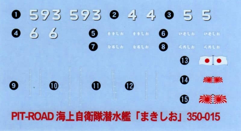 This kit builds a full-hull submarine, the Oyashio, molded in grey plastic. Includes a base for display and decals for seven marking options.