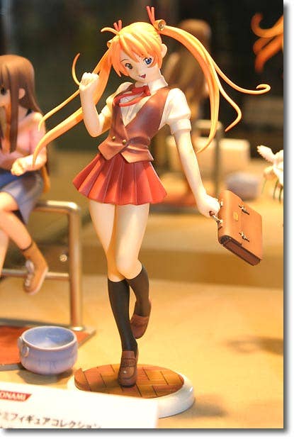 Really sweet and energetic, completed and painted PVC figure of Kagurazaka Asuna from "Mahou Sensei Negima!" stands about 18 cm tall (she's in an odd sort of pose, up on her toes and leaning back, so that's a rough measurement) and comes with a custom base for display. Please note that figures such as this are mass produced and as a result some inconsistencies in finish and painting may occur; these are not considered manufacturer's defects. If you absolutely must have perfection, prepare to do some touch-up work on your own.